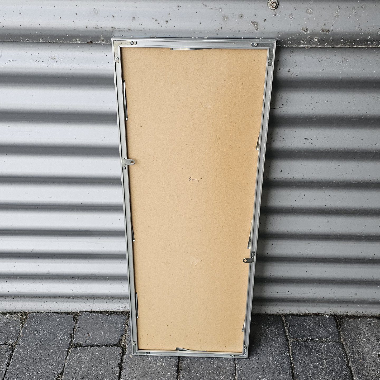 Litografi med blå, hvide og gule farver på lyseblå baggrund i metal ramme. 13/92