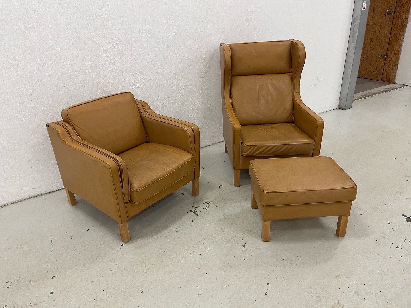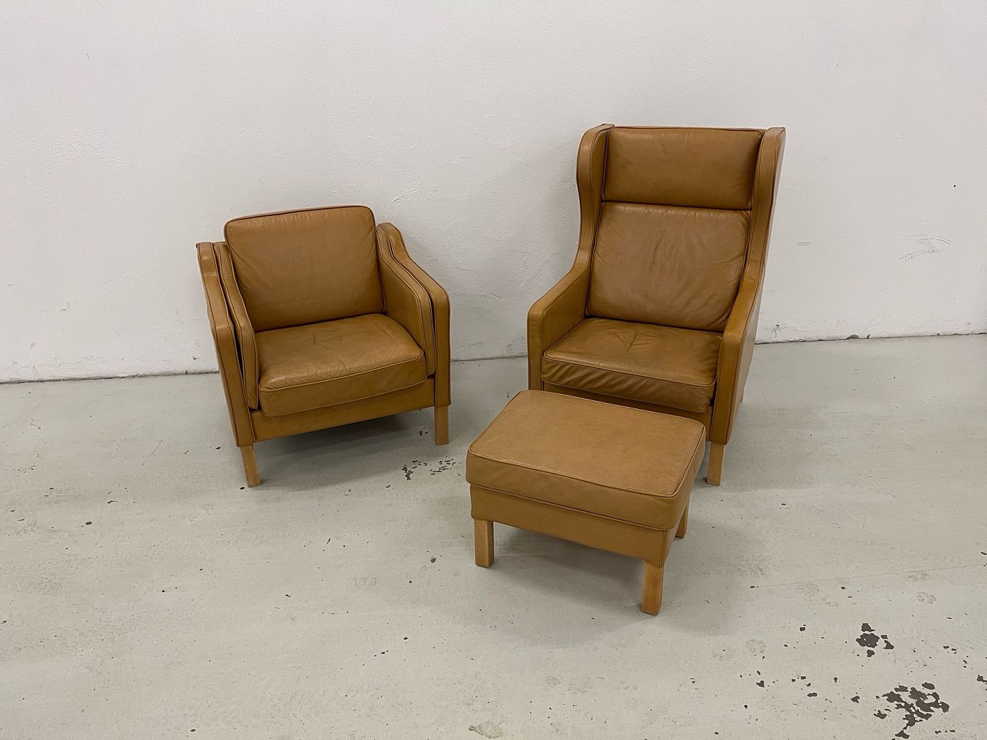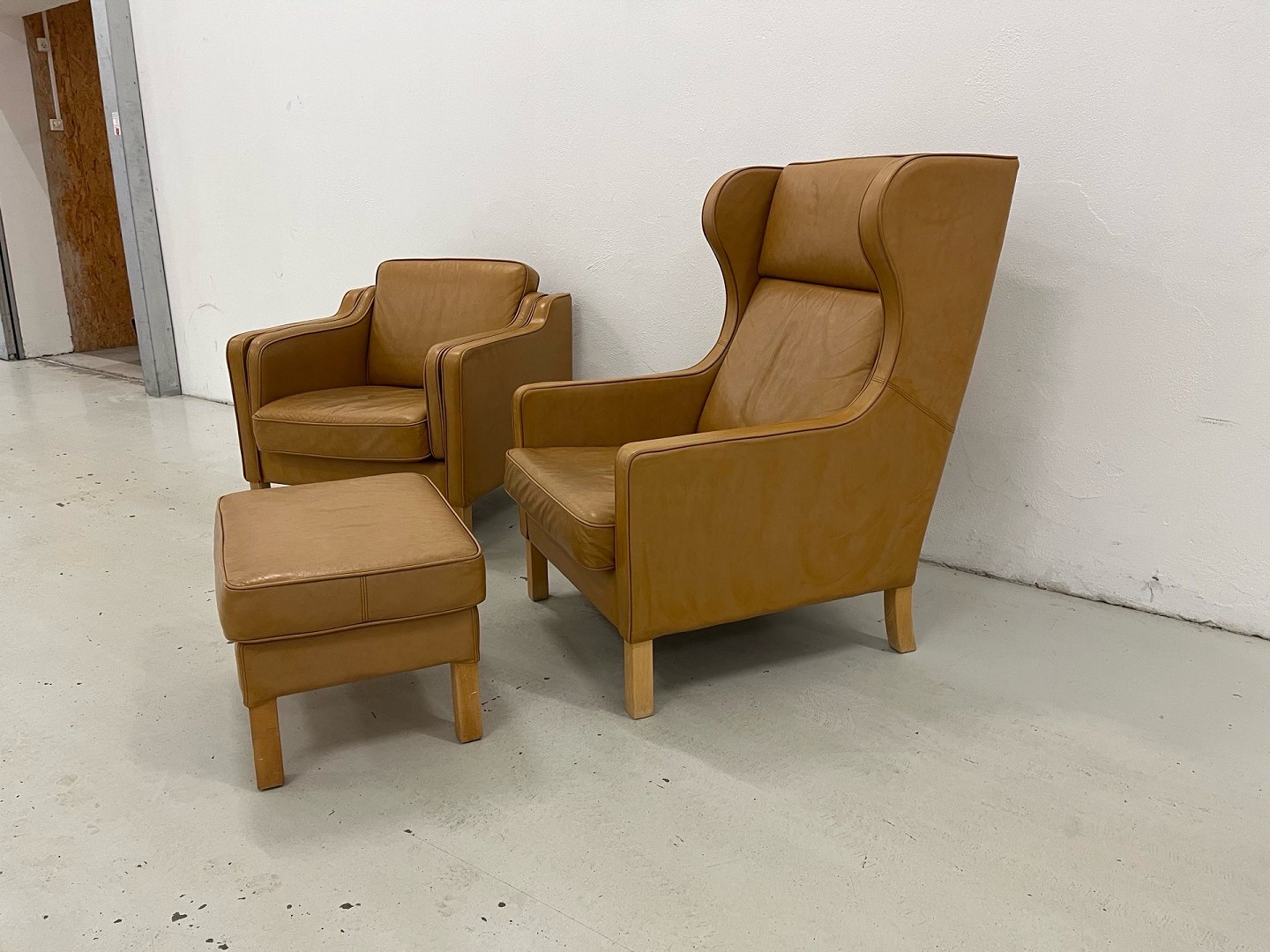Skalma Cerena øreklapstol samt lav stol med tilhørende skammel. oprindelig ny pris. 36.400,-Eksklusivt sæt bestående af Skalma Cerena øreklapstol, lav stol og skammel, udført i semianilin cognacfarvet læder (668/08) med ben i lys sæbebehandlet bøg.