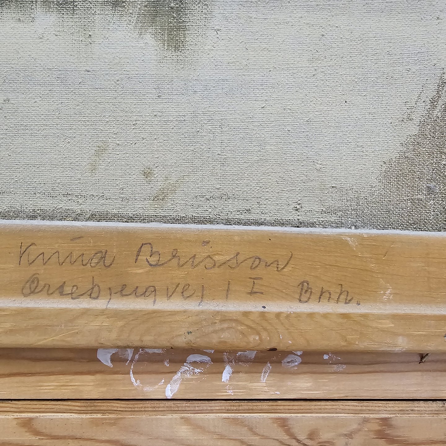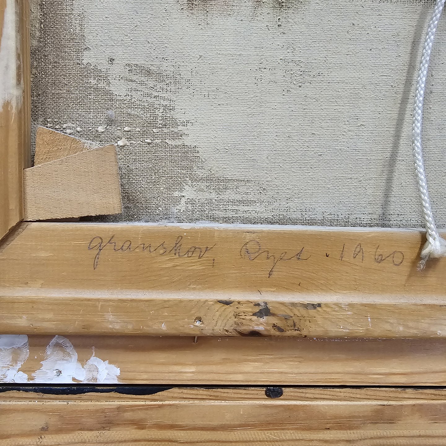 Oliemaleri på lærred med titlen Granskov. Monteret i sortmalet ramme med motiv af en sti gennem grantræer, dateret 1960