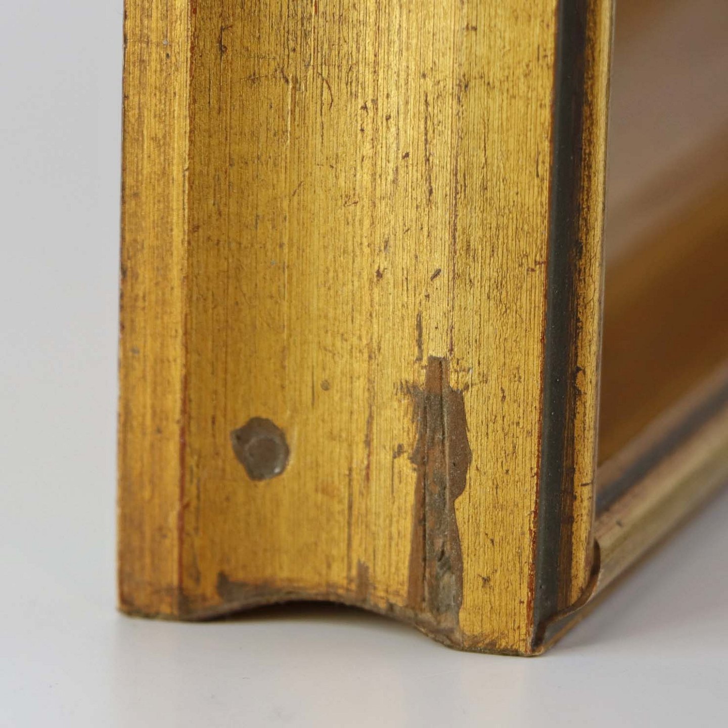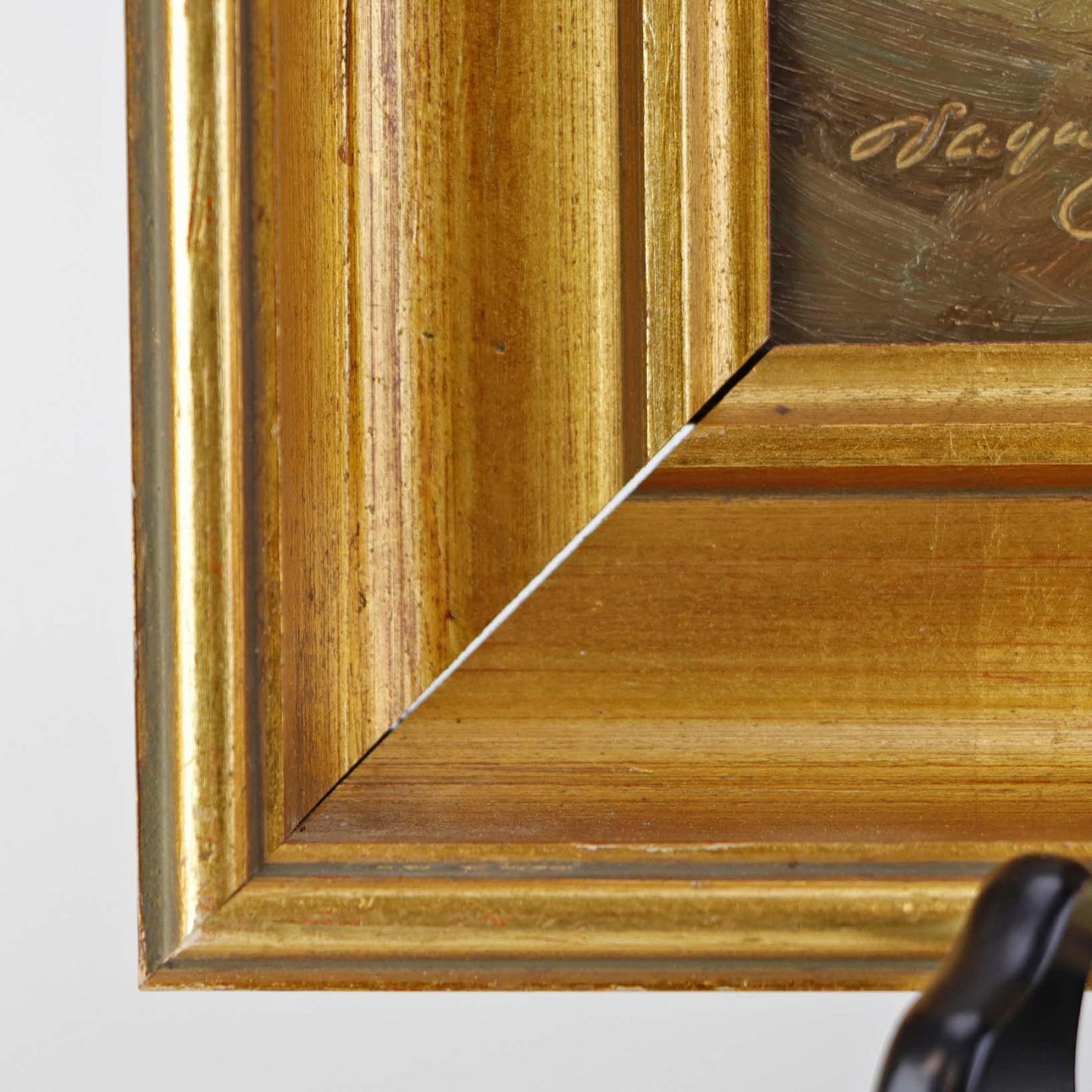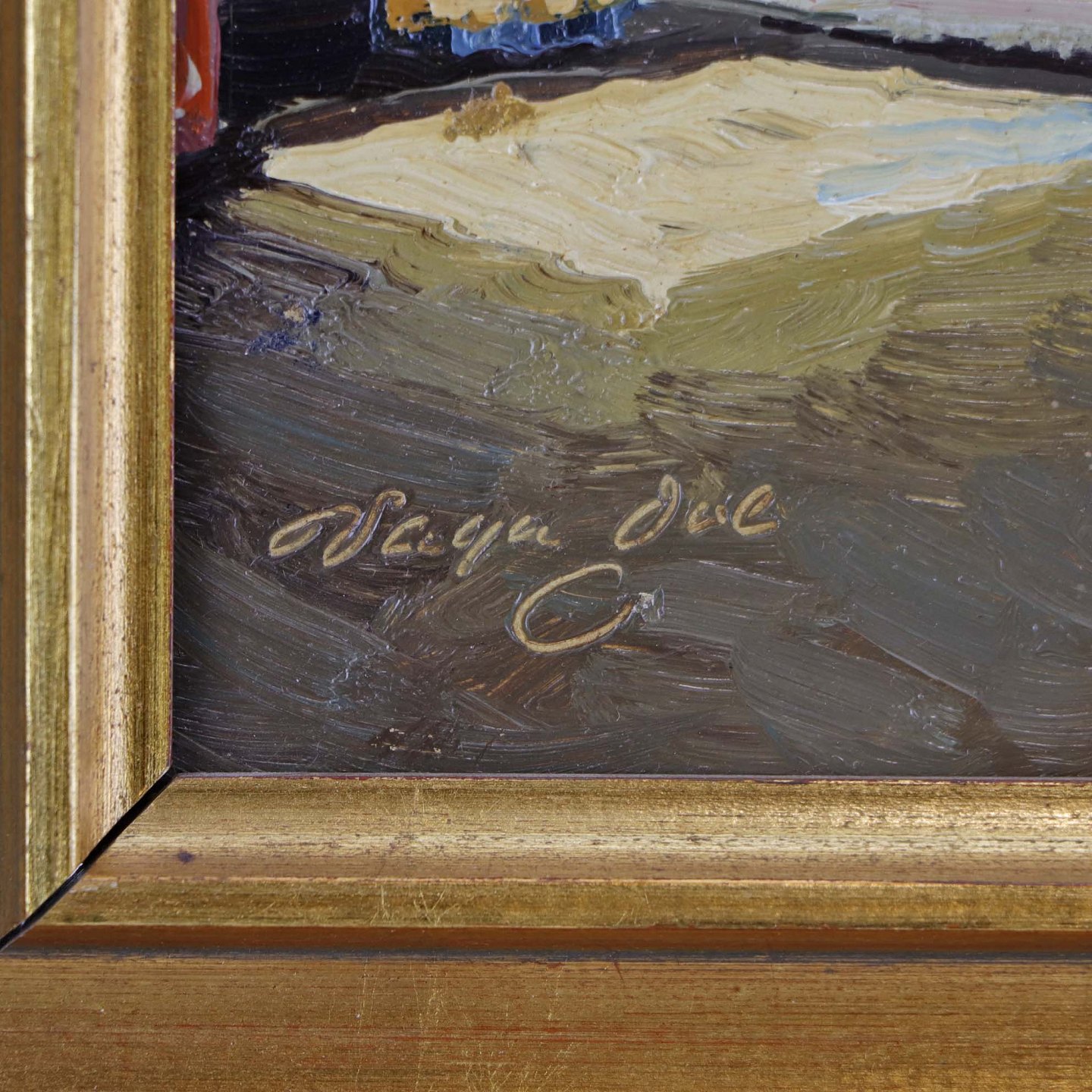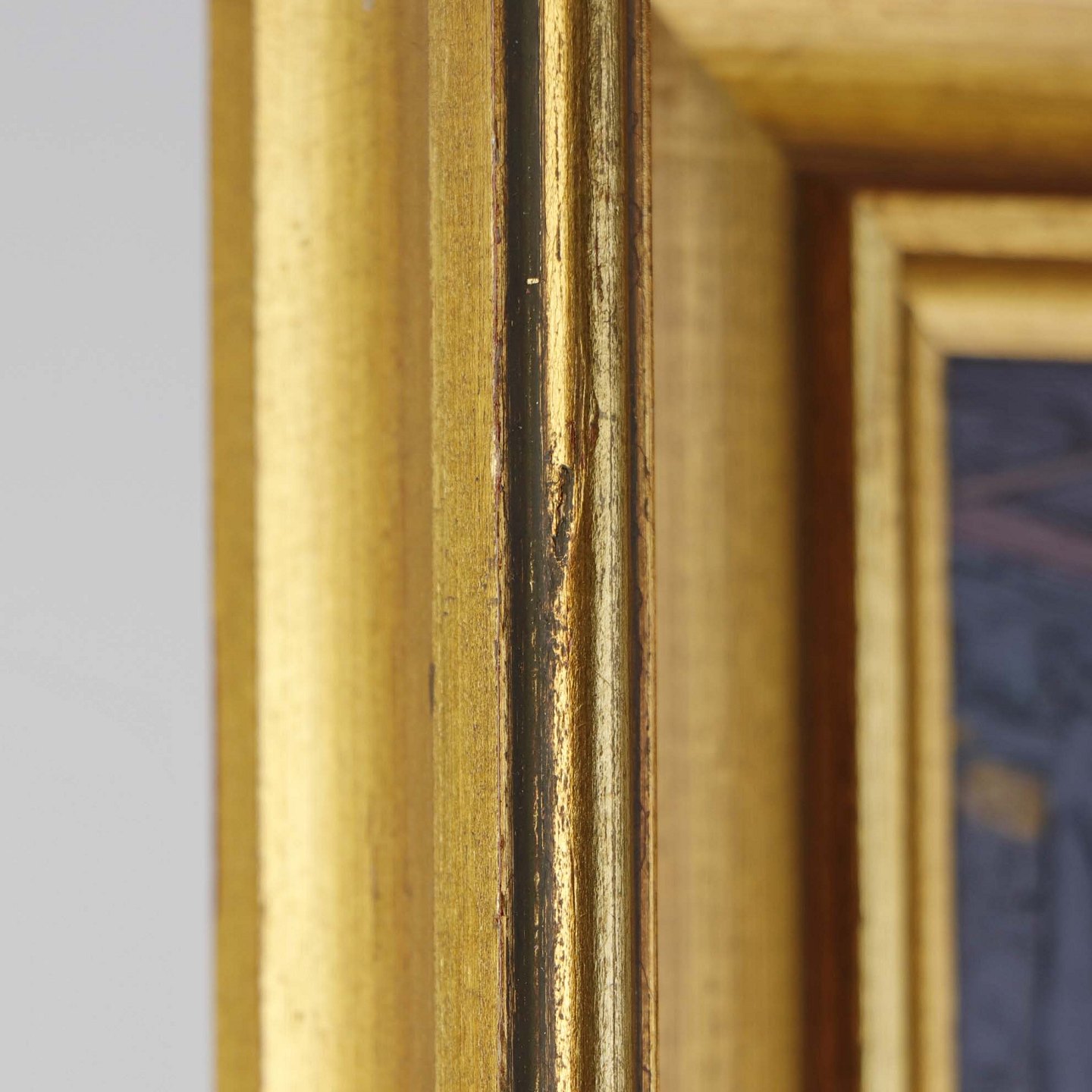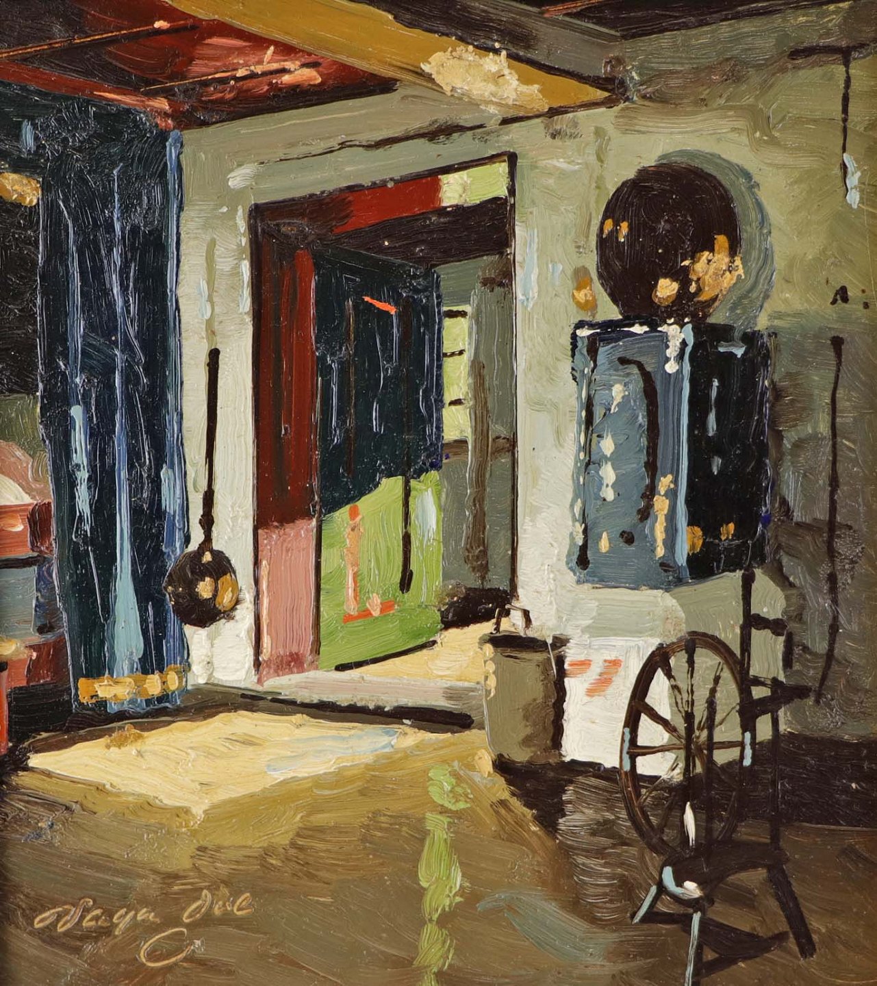 Maleri på plade i guldmalet træramme med med ældre interiør motiv fra dansk bondehus.Kunstner Vagn Ove Schnach (f. 1931)