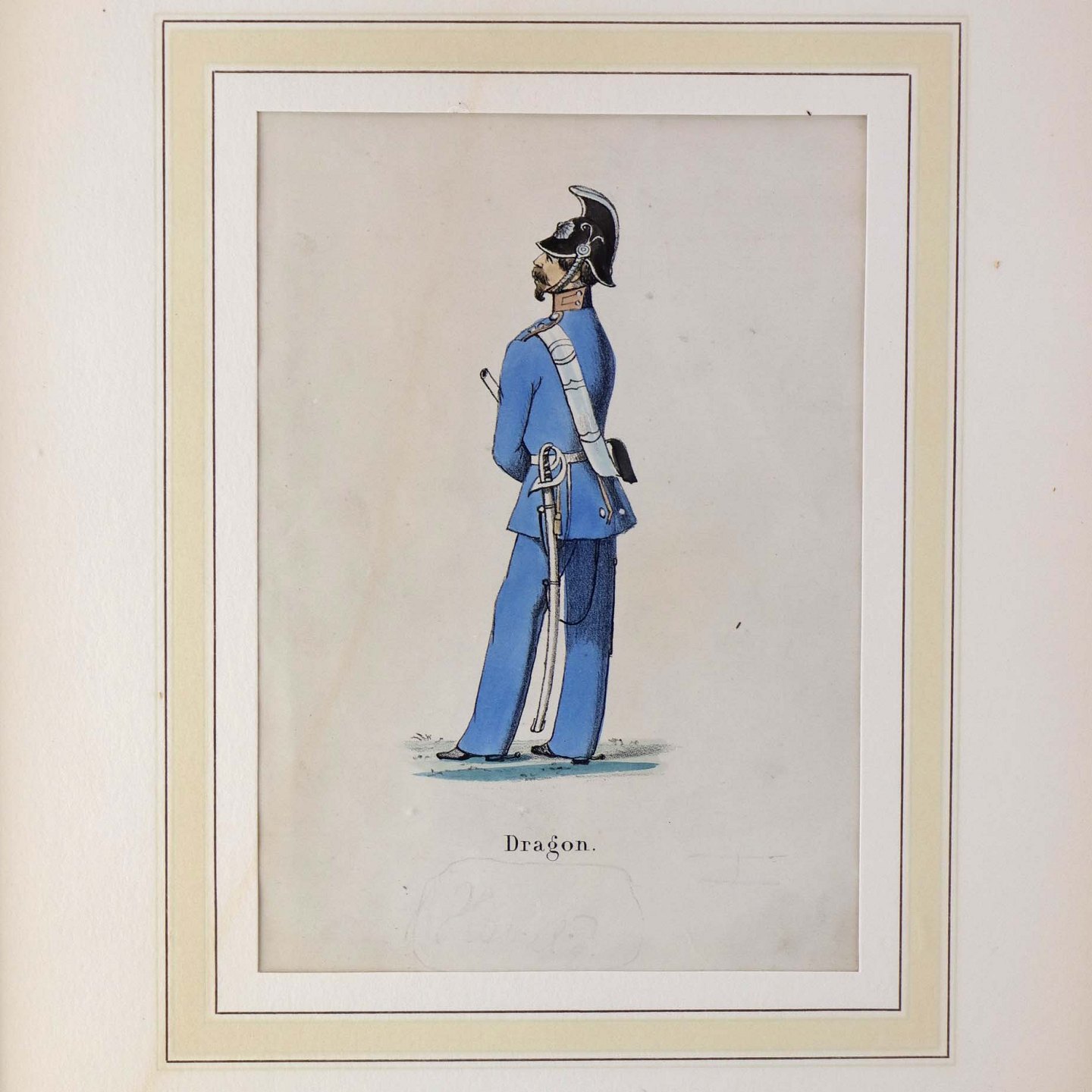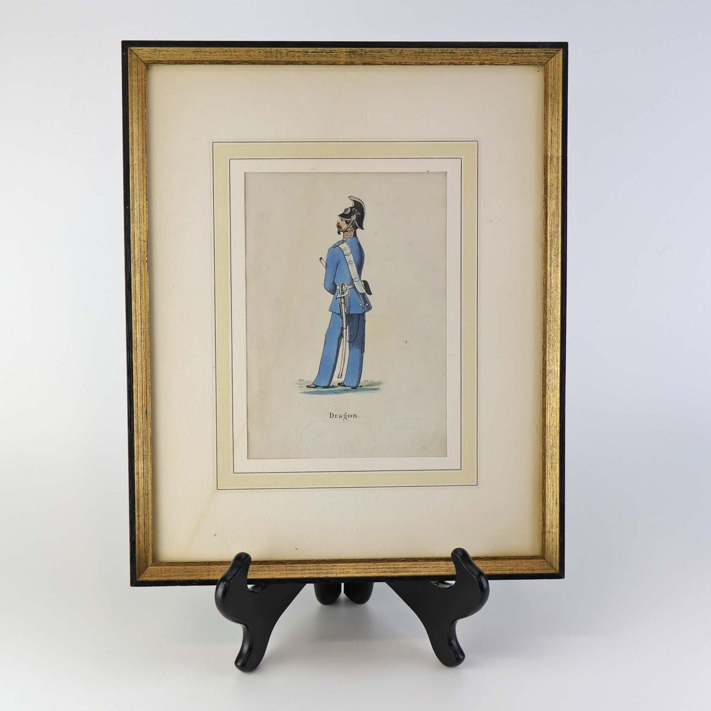 Originalt kobberstik fra år 1858 i træramme med teksten Dragon og motiv af en soldat i blå uniform.Kunstner ukendt