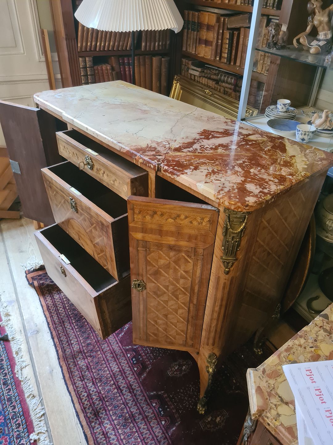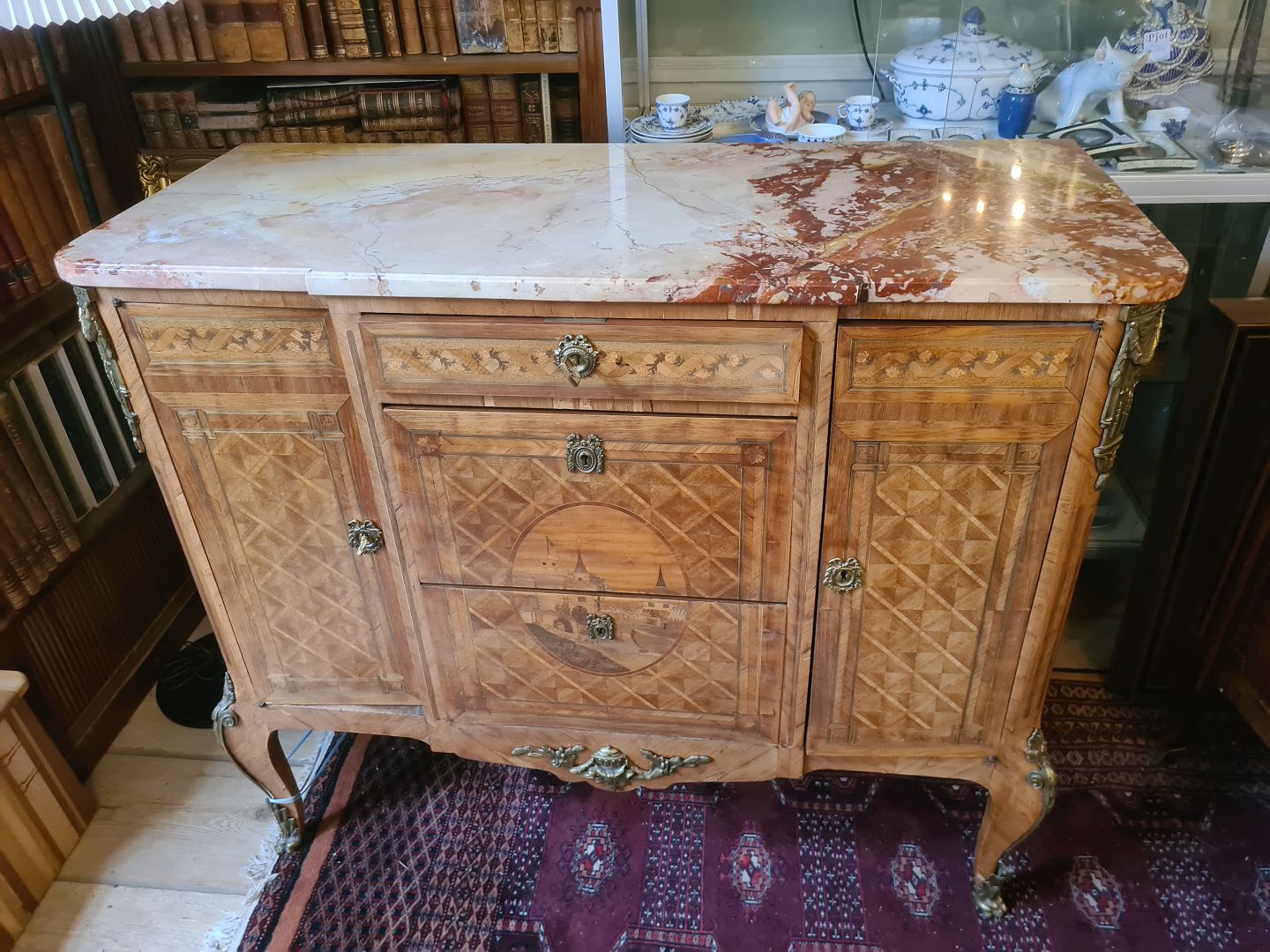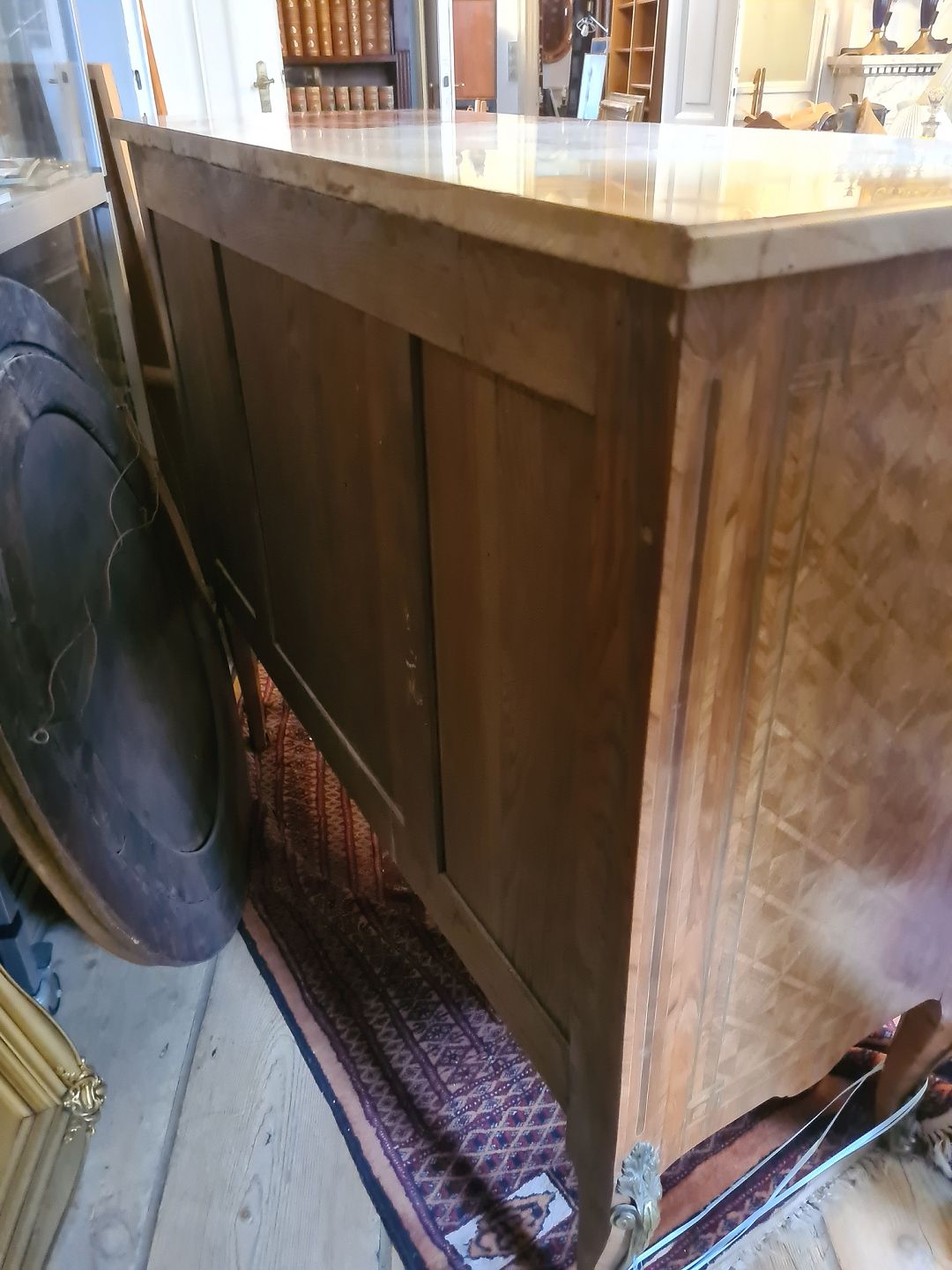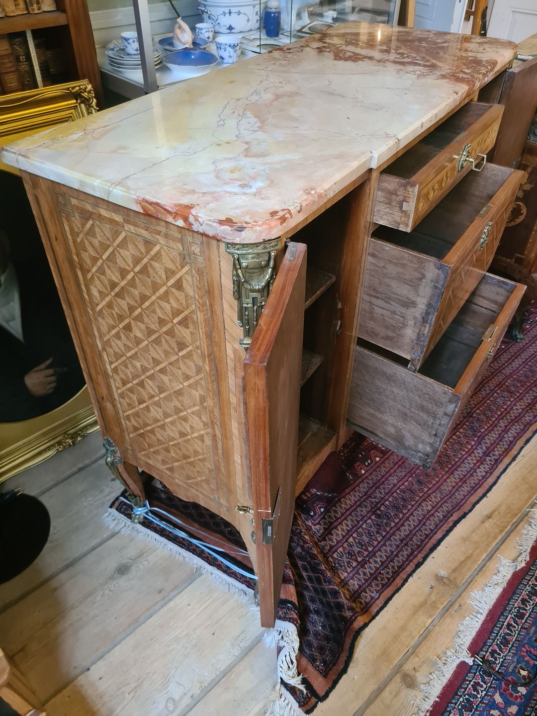 Kommode fra sidst i 1800 tallet. Fremstillet i rokokostil med låger og løstliggende marmorplade på toppen. Fremstår pæn og velholdt uden de store brugsspor.Højde 105 cm. Bredde 122 cm. Dybde 51 cm.