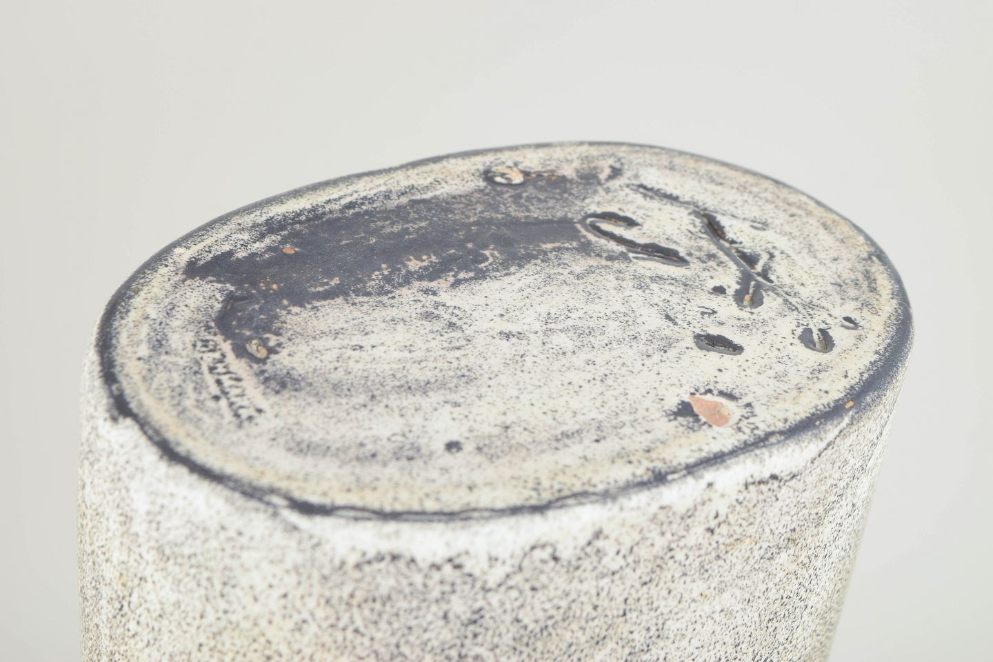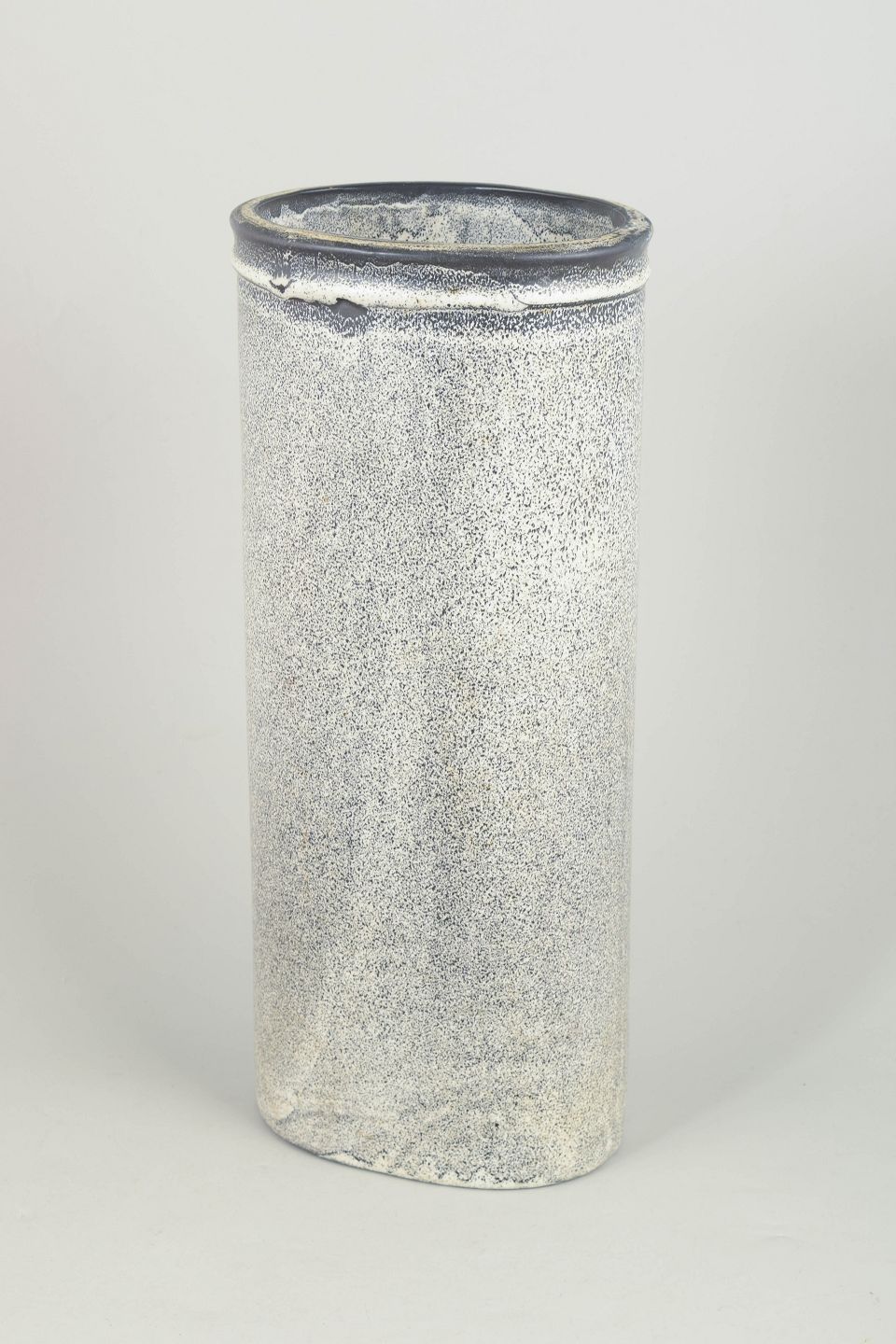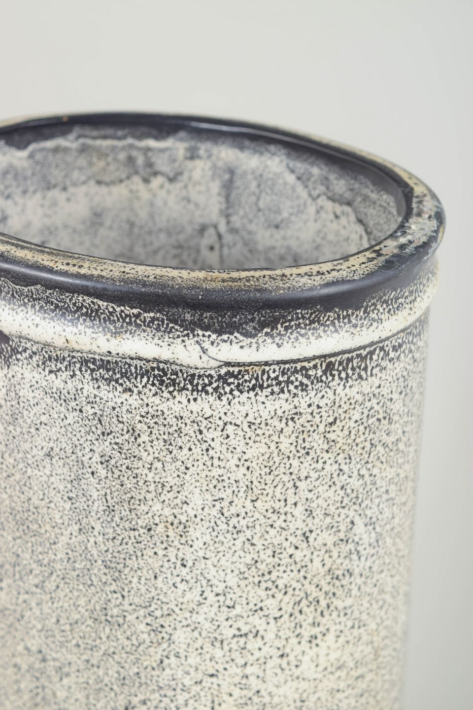 Svend Hammershøi for Kähler, stor vase.Stor vase i stentøj med cylindrisk form og karakteristisk dobbelt glasur i sorte og grå nuancer med levende, let krakeleret overflade. Et markant eksempel på Hammershøis monumentale formsprog og eksperimenterende glasurarbejde fra 1930’erne. Stemplet i bunden.