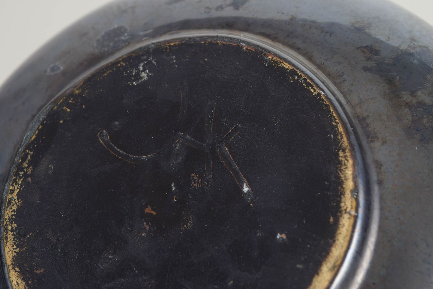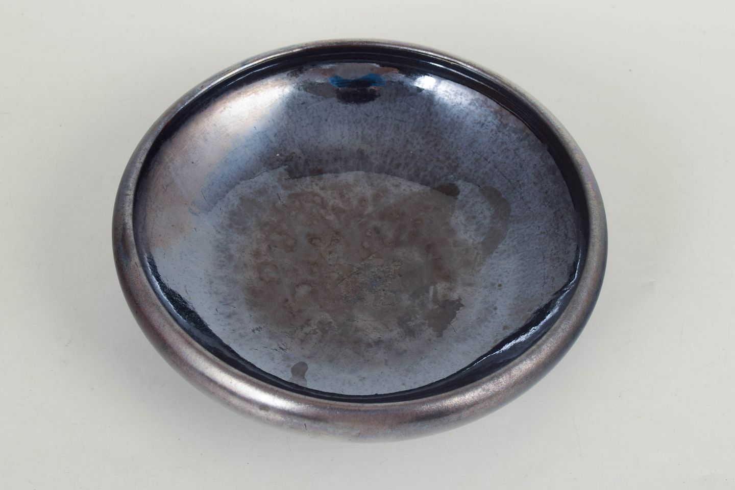Svend Hammershøi for Kähler, skål.Dekorativ skål i stentøj med enkel, lav form og karakteristisk lustreglasur i mørke nuancer med fine spil i overfladen. Et klassisk eksempel på Hammershøis stilrene formsprog og sikre glasurarbejde fra 1930’erne. Stemplet i bunden.