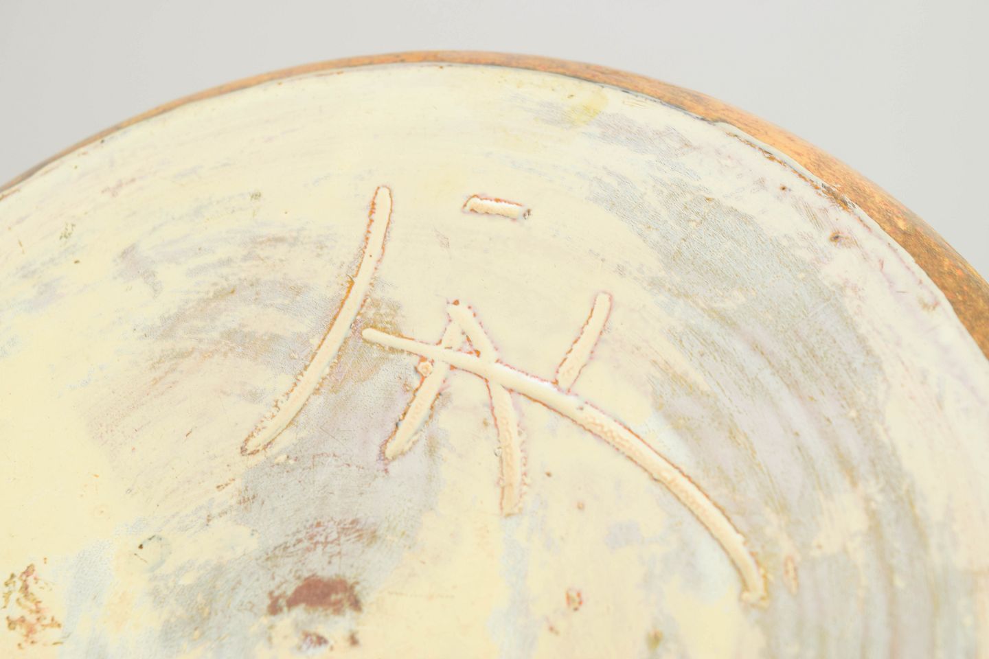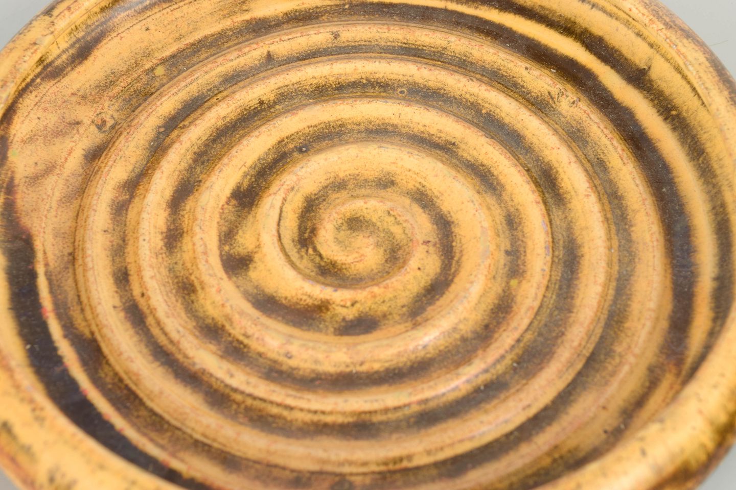 Svend Hammershøi for Kähler, fad.Dekorativt fad i stentøj med karakteristisk spiralornamentik og uranholdig glasur i gyldne og brunlige nuancer. Et markant eksempel på Hammershøis formsprog og eksperimenterende glasurarbejde fra 1930’erne. Stemplet i bunden.