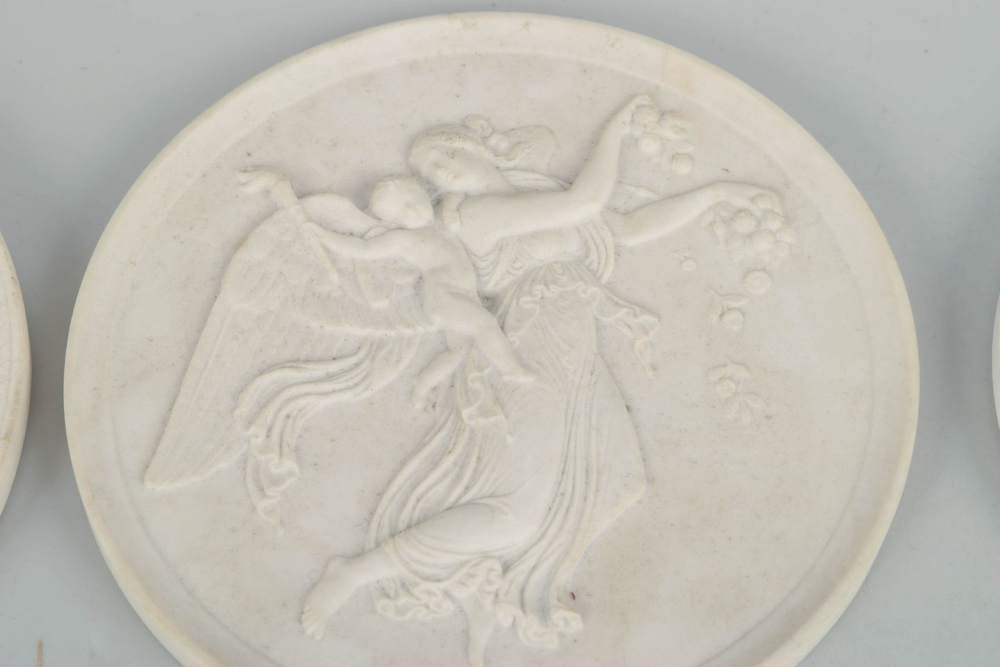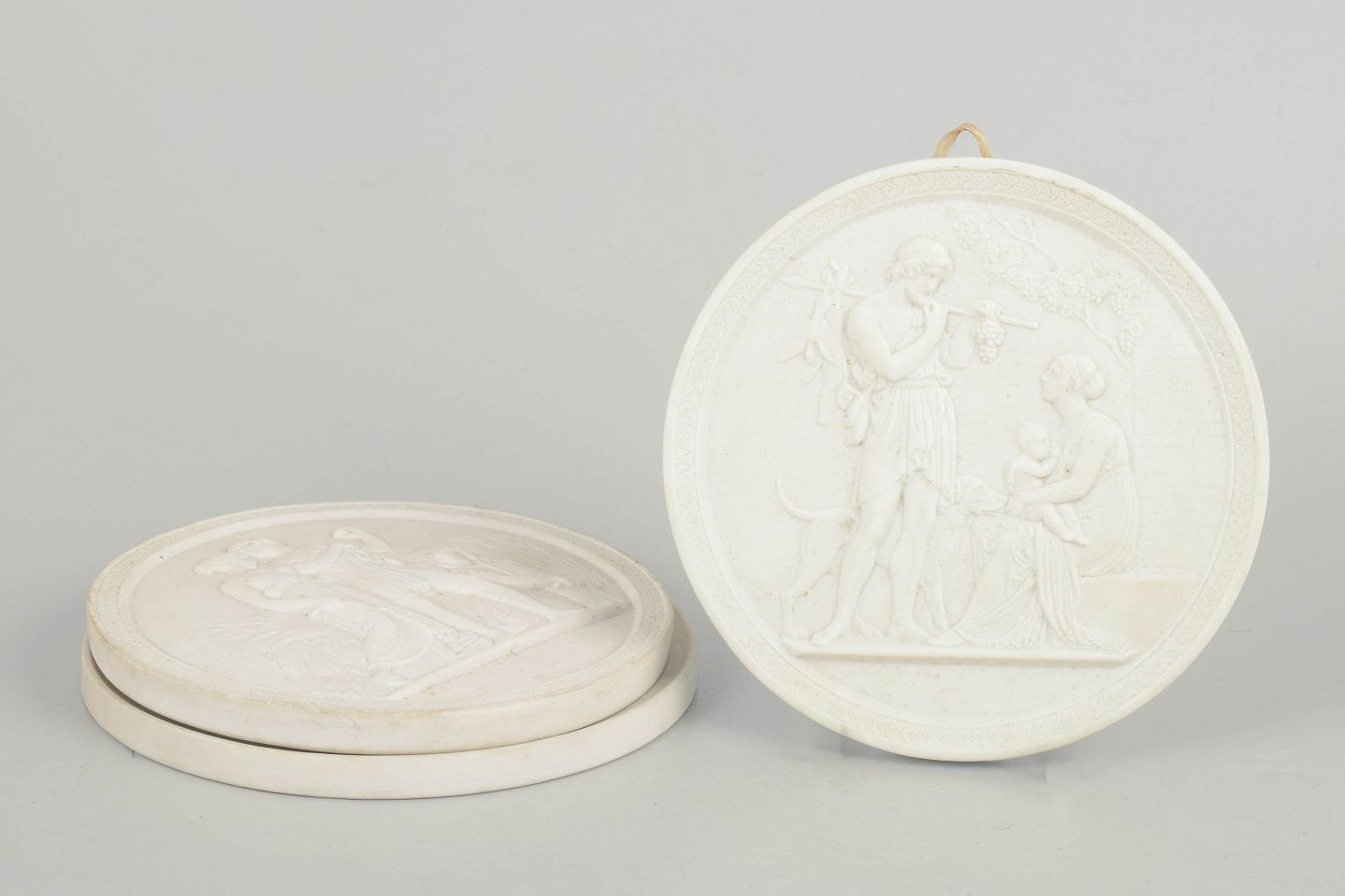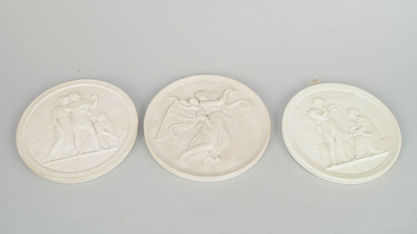 Royal Copenhagen, sæt af tre biscuit vægrelieffer efter Thorvaldsen.Relieffer i hvidt uglaseret porcelæn med klassiske motiver efter Bertel Thorvaldsen, udført i fin biscuit med detaljeret figurdekoration og ophæng på bagsiden. Første sortering.