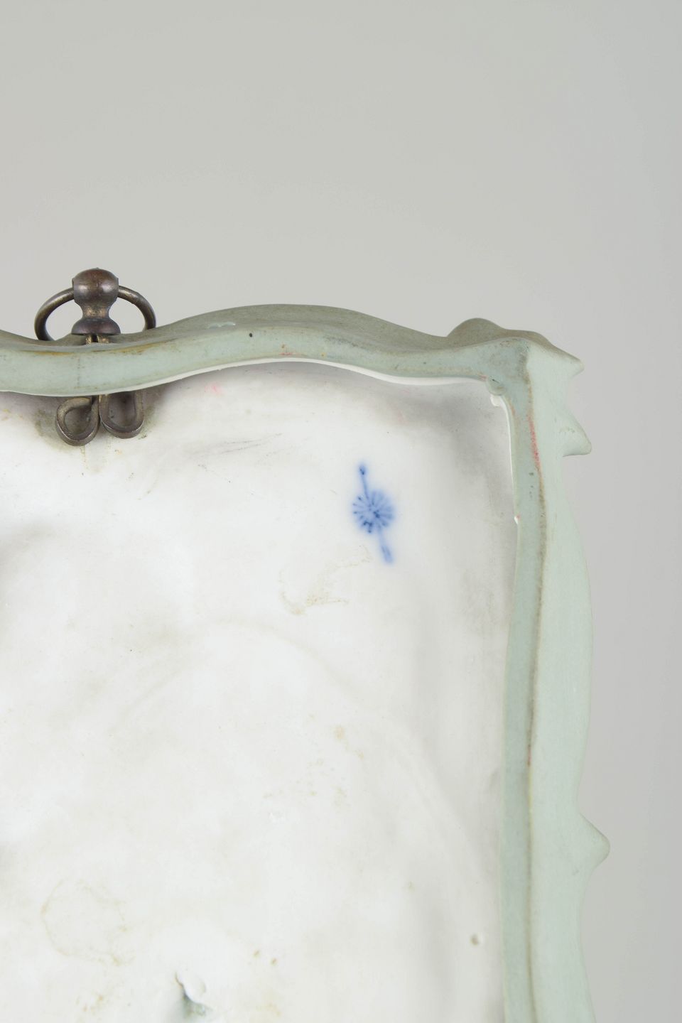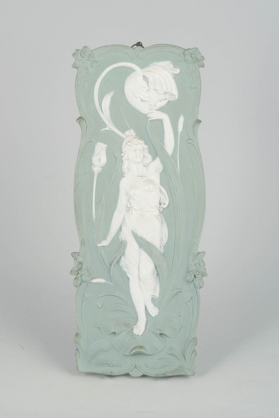 Triebner Ens & Co , vægrelief i biscuit og jasperware.Dekorativt art nouveau vægrelief i lysegrøn jasperware med hvid reliefdekoration forestillende en kvindefigur i bevægelse omgivet af organiske blomsterformer. Fremstillet i biscuitporcelæn med fin detaljering og klassisk jugendstil udtryk. Bagside med ophæng og fabriksmærke.