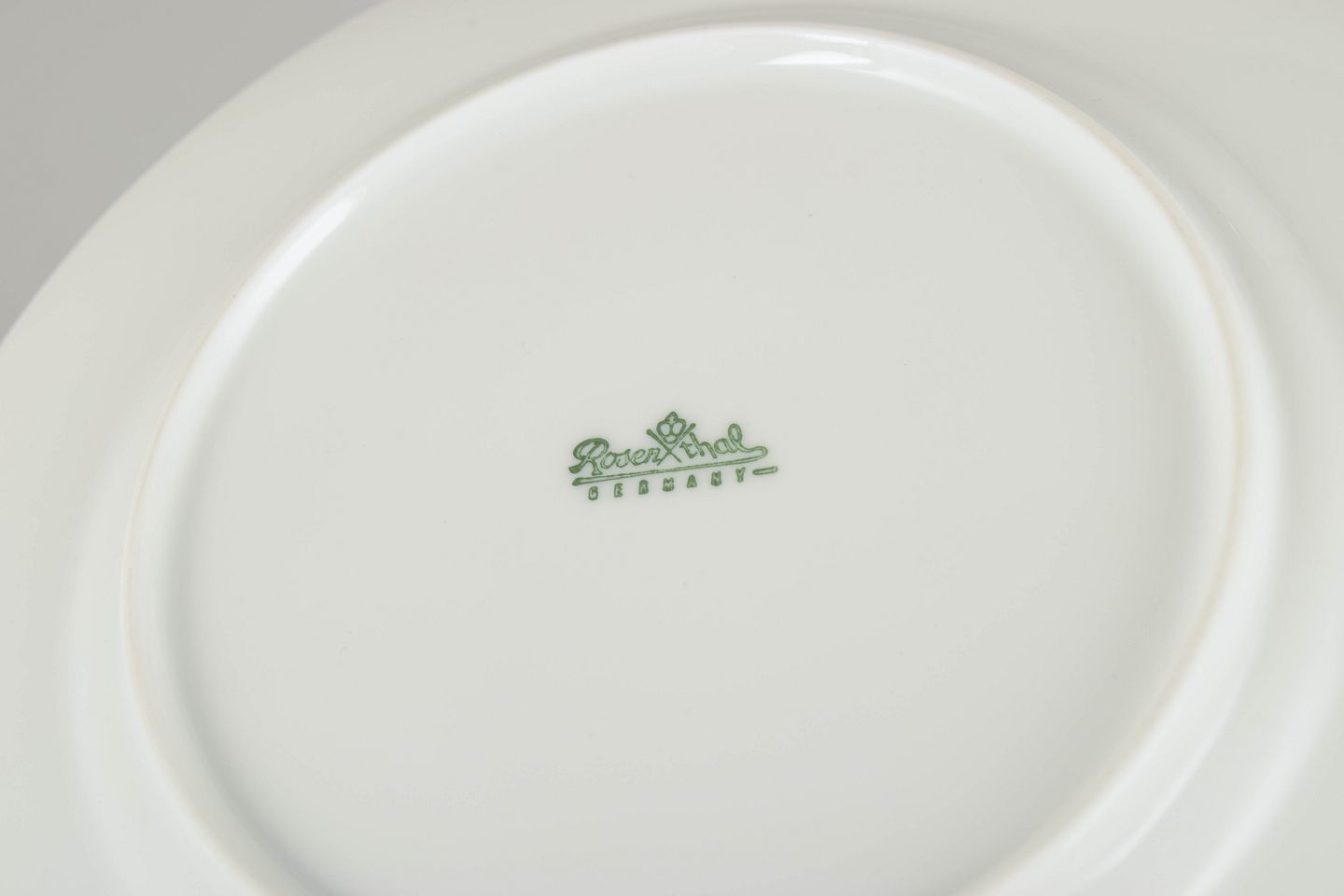 Enkle og elegante tallerkener i hvidt porcelæn med klassisk form og let forhøjet fane. Tidløst design fra Rosenthal, velegnet til både hverdagsbrug og opdækning.