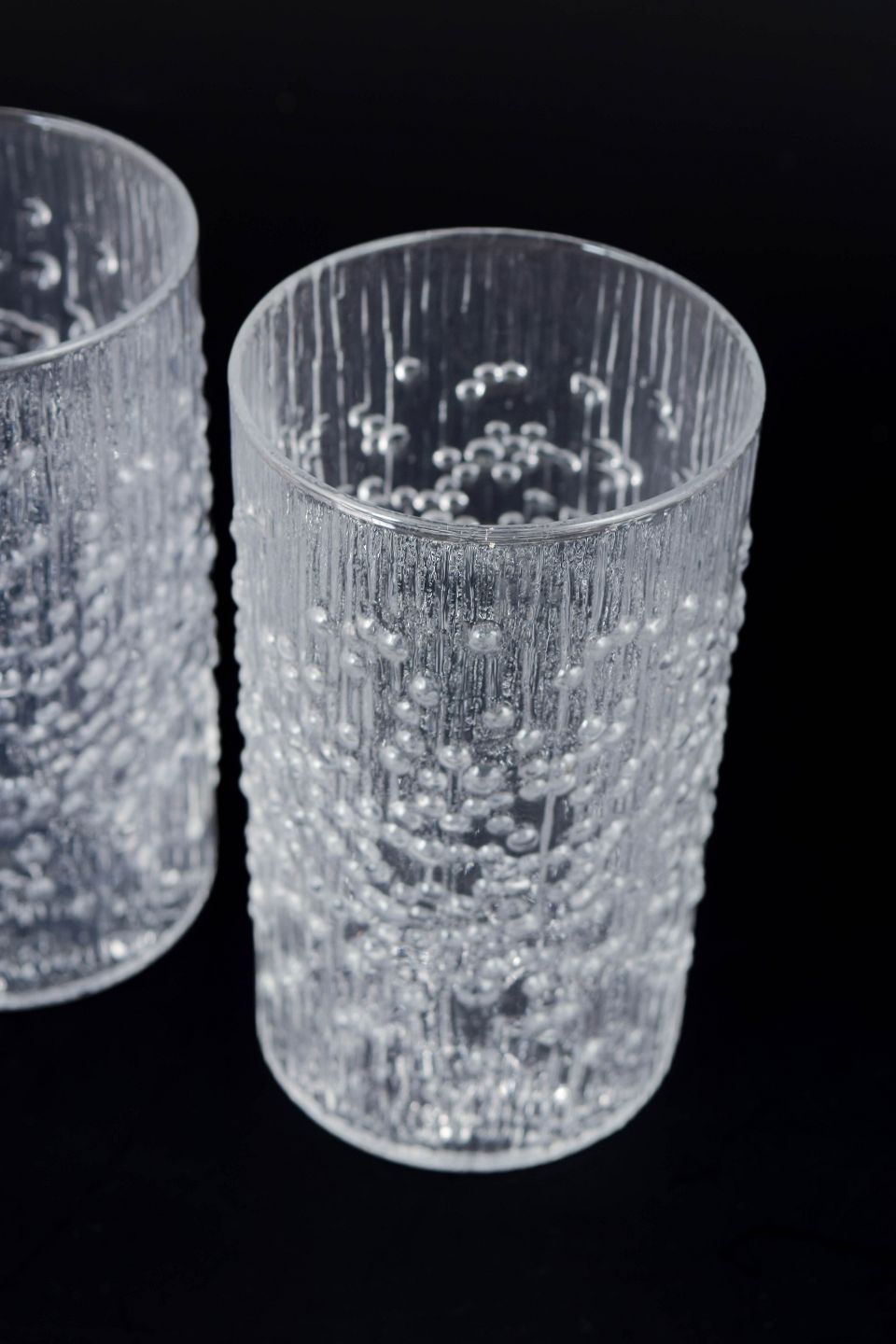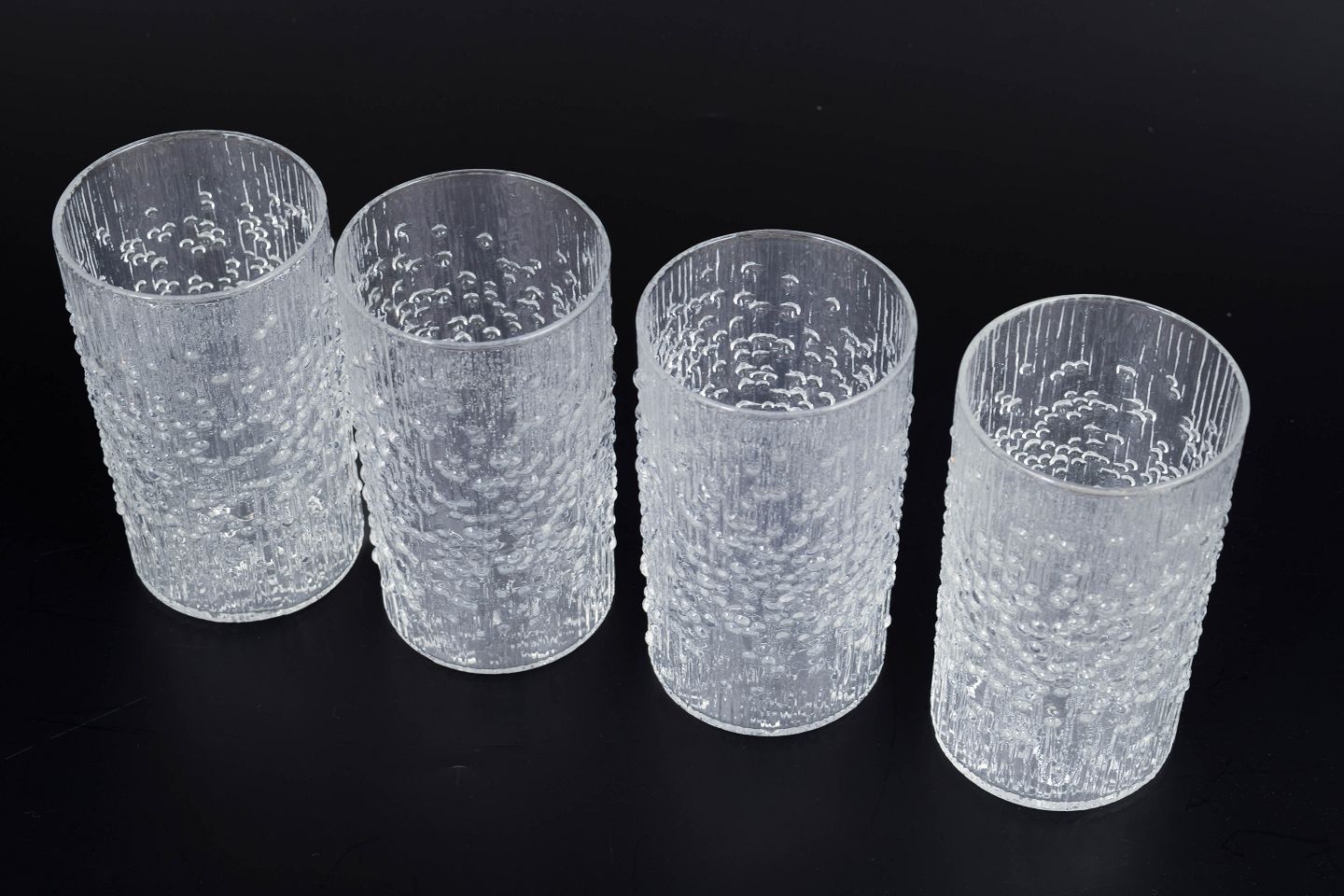 Sæt af fire drikkeglas i presset glas med karakteristisk organisk struktur og reliefmønster, der skaber et levende lysspil i overfladen. Designet er et klassisk eksempel på finsk glasdesign fra perioden. Model Hopla i klart glas.
