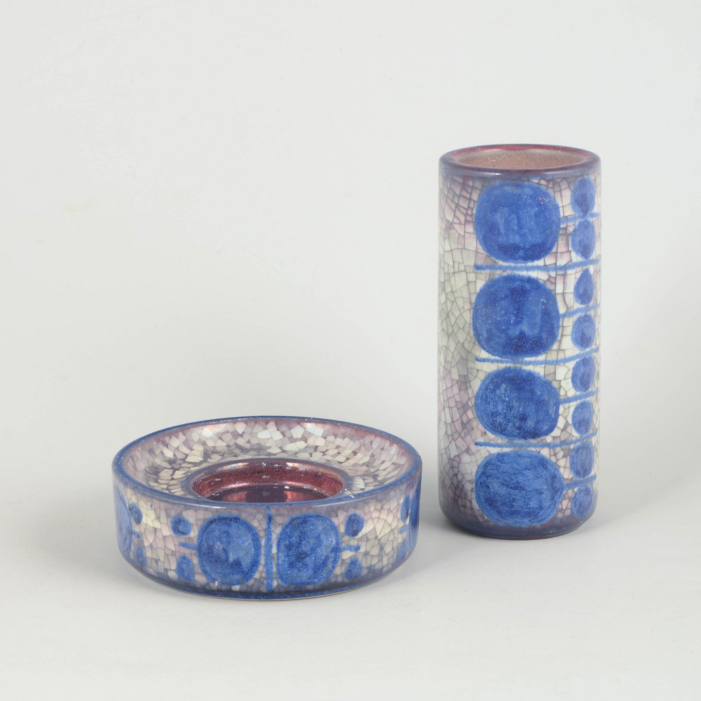Dimensioner: Lysestage: H. 4 cm, D. 11 cm. Vase: H. 14 cm, D. 6 cm.