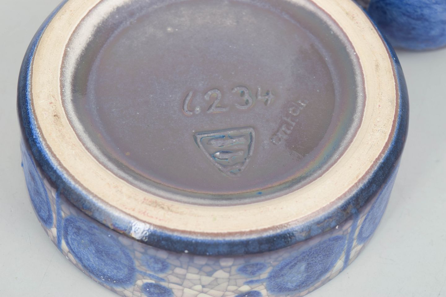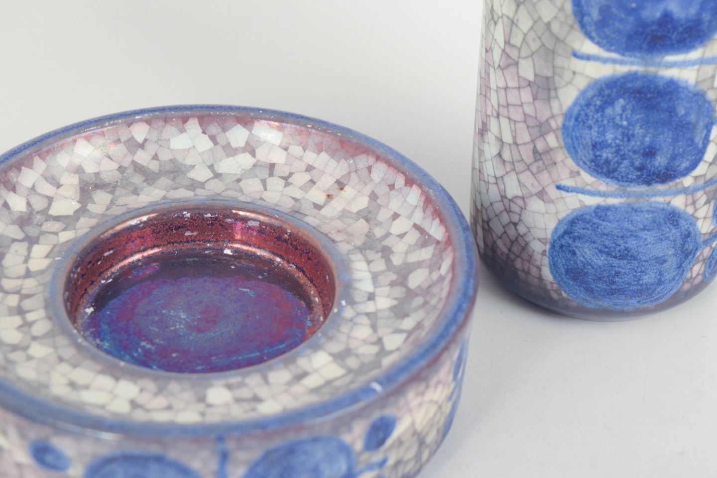 Marianne Starck for Michael Andersen, Bornholm, lysestage og vase.lysestage og vase i stentøj med karakteristisk reliefdekoration og blå glasur. Klassisk Bornholm arbejde med dekorative cirkelmotiver og tydelig håndværksmæssig kvalitet. Stemplet i bunden.