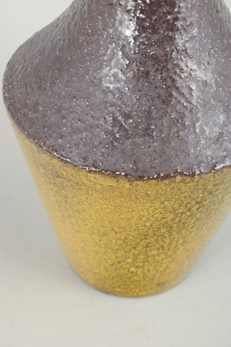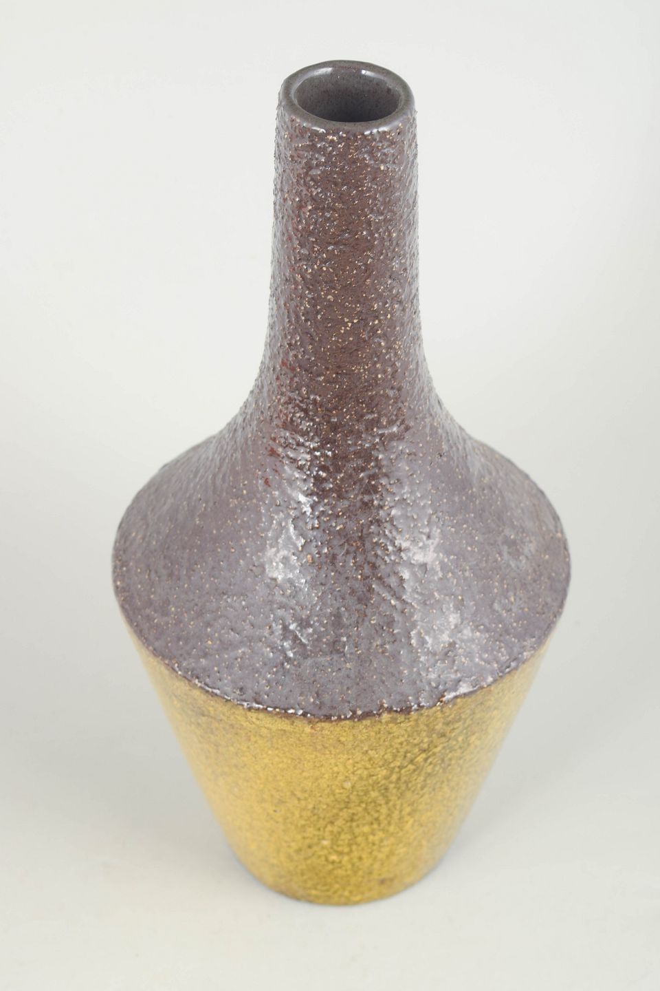 Ingrid Atterberg for Upsala Ekeby, vase.Elegant, høj vase i stentøj med slank form og karakteristisk tofarvet glasur i gul og brunviolette nuancer. Modellen 4330/676 fra 1960’erne fremstår med en raffineret overflade og klassisk skandinavisk formsprog.