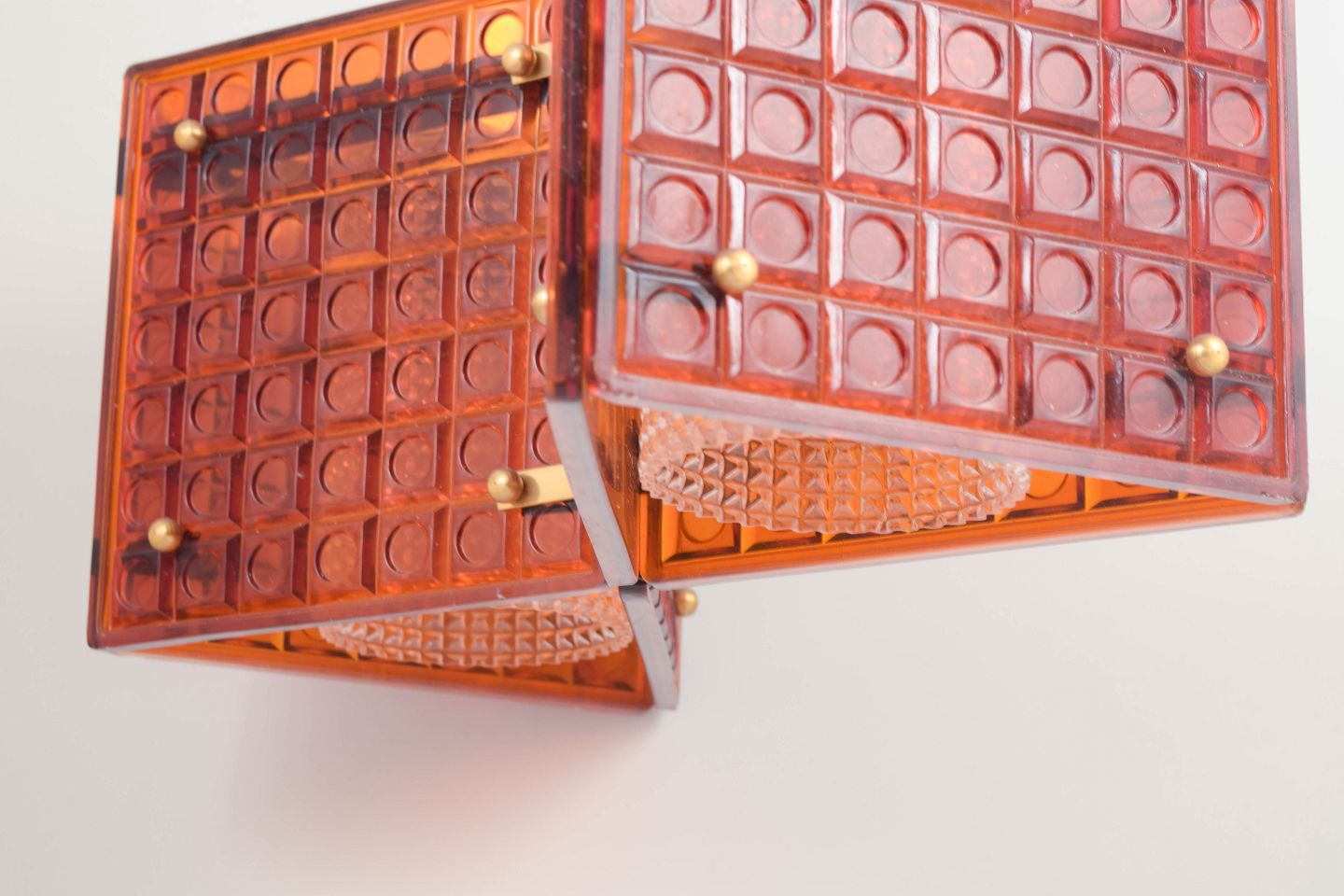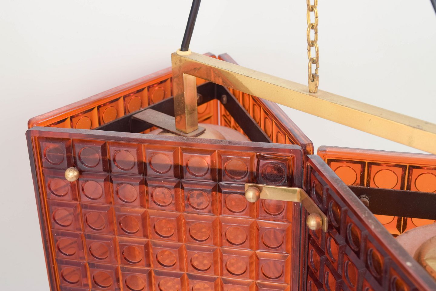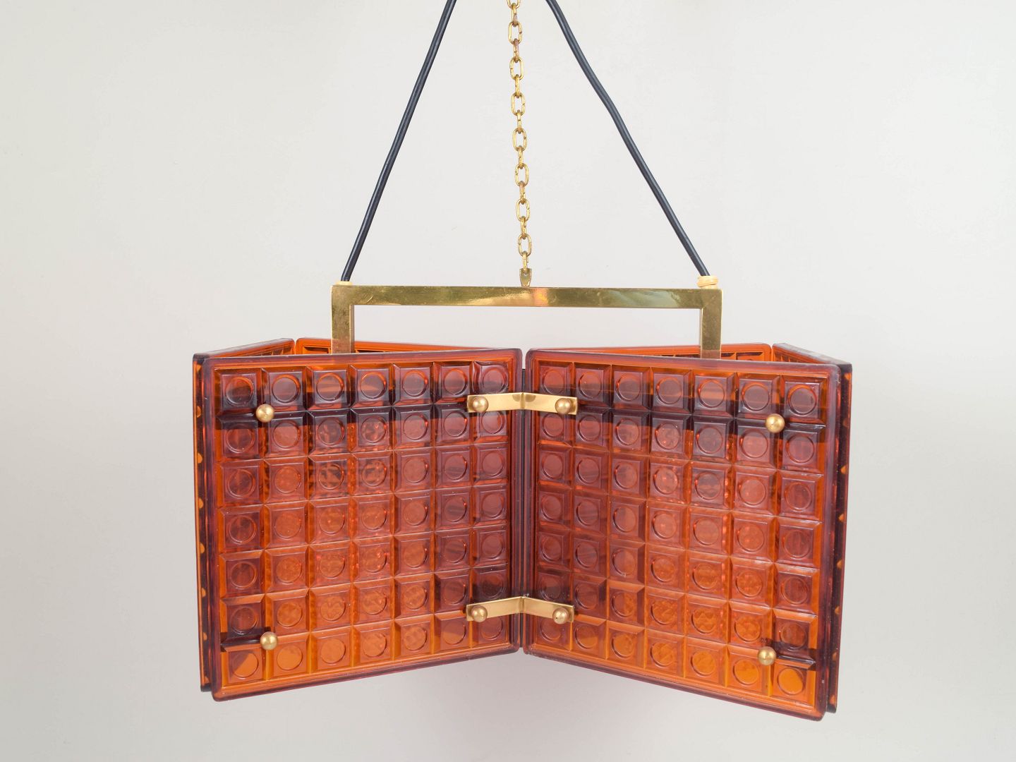 Mac Hegerup for Kronoberg, pendel lampe i ravfarvet glas og messing.Dekorativ loftlampe med geometrisk form opbygget af glasfelter i varm ravtone indfattet i messingstruktur. Ophæng i metaltråd, giver et elegant og let udtryk med smukt lysgennemfald.