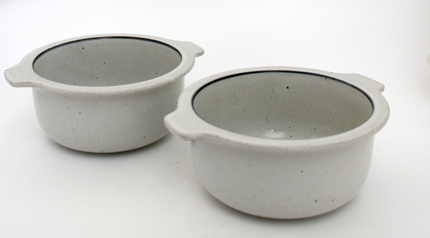 Knabstrup, Skåle med hank eller ører i stentøj, 2 stk. Højde 6 cm. Diameter 14 cm. Fin stand. Pris for sættet: 175 kr. Udstiller