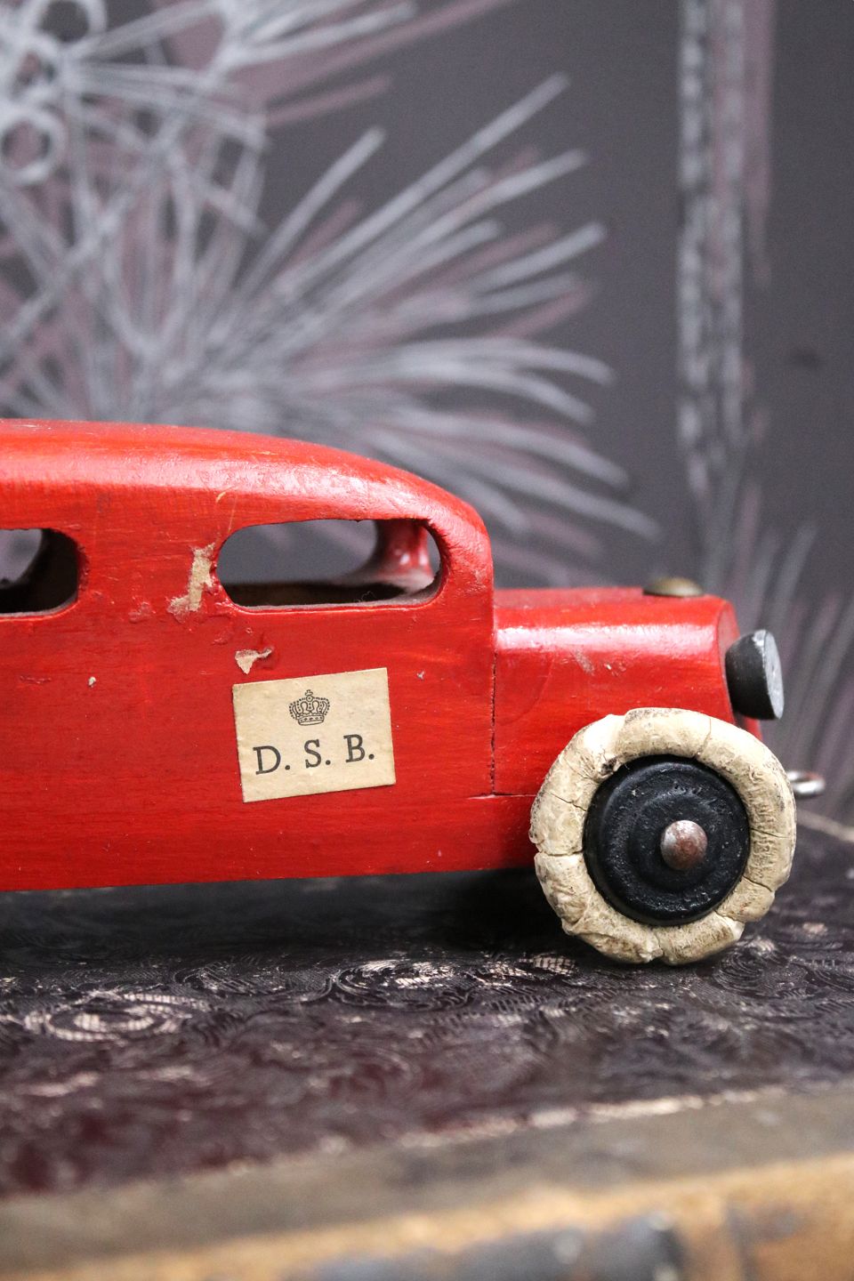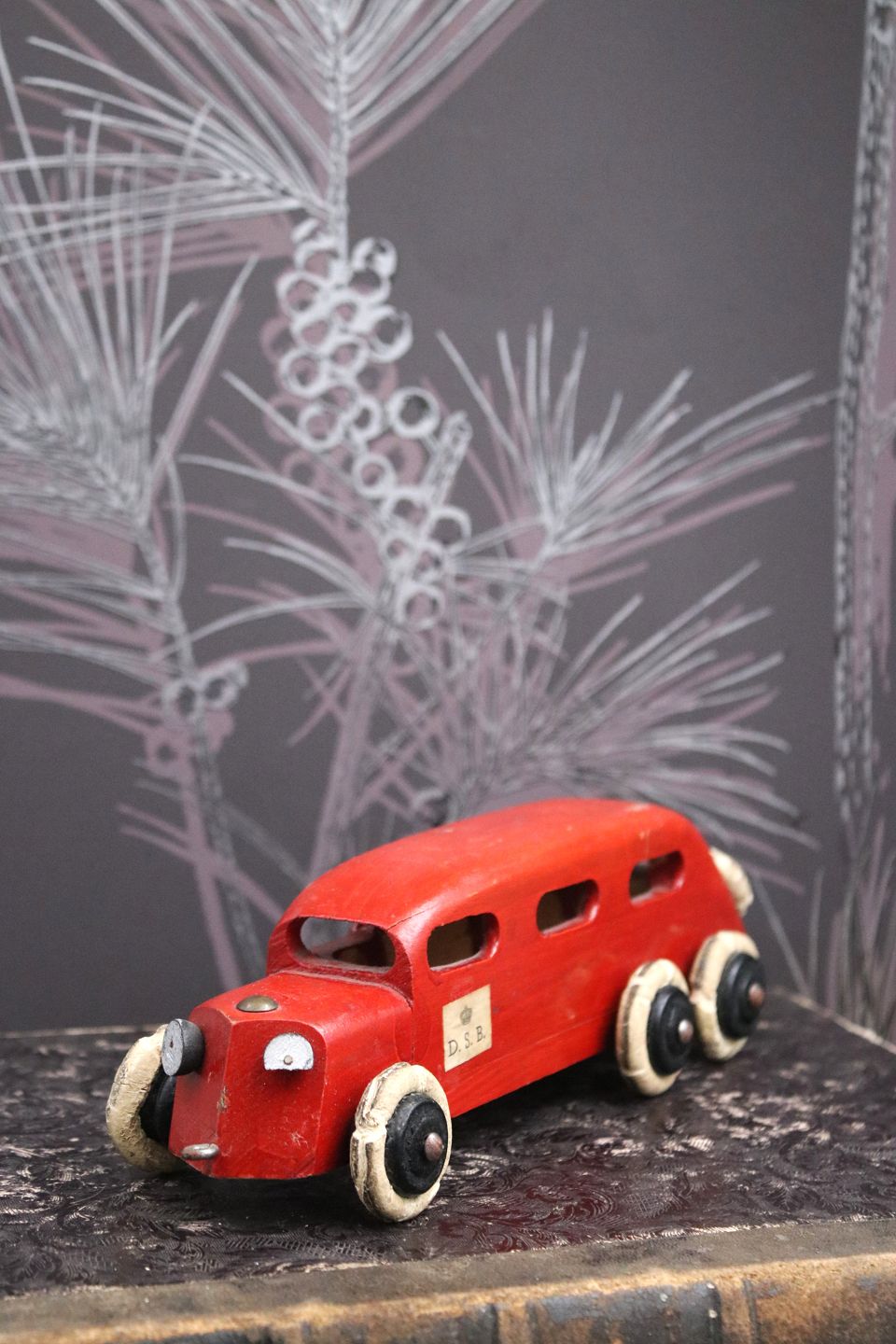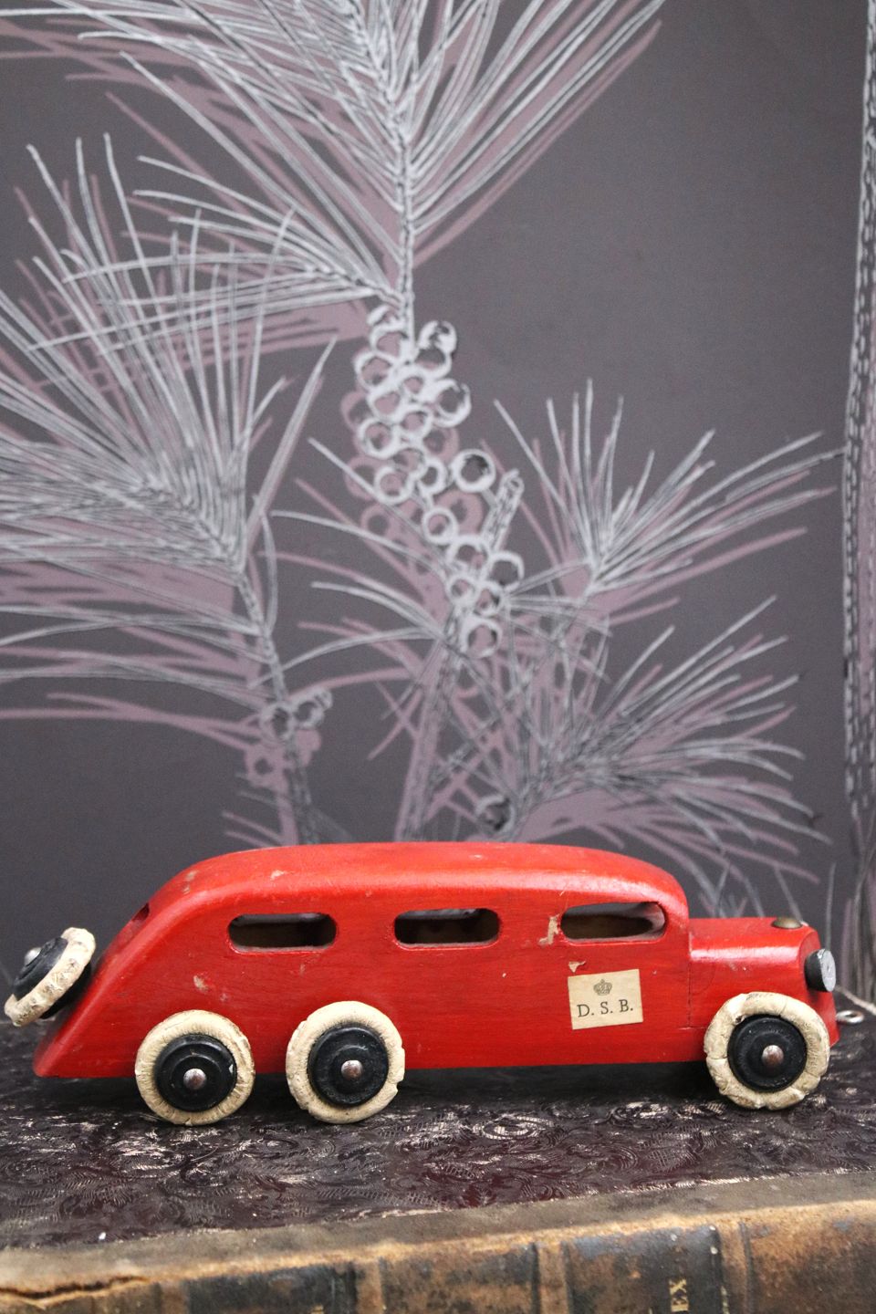 Dekorativ, gammel vintage rutebil i rødmalet træ med DSB skilt på døren og en fin gammel patina. H: 6,5cm. L: 22,5cm.Emne nummer: Vintage træ bil