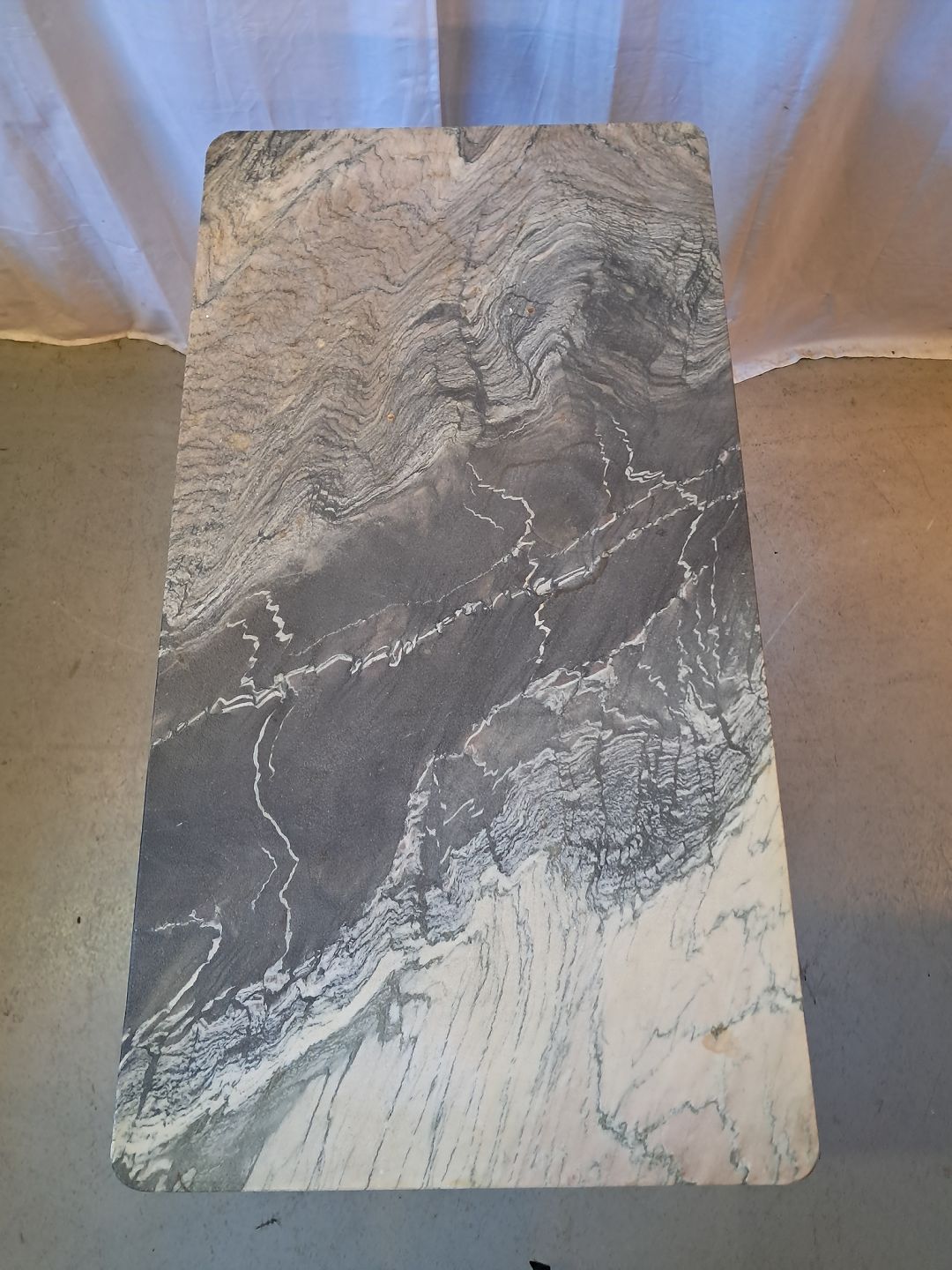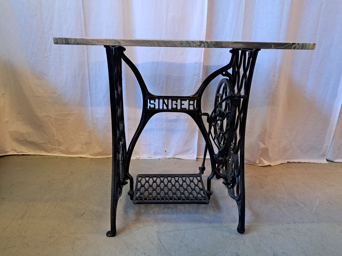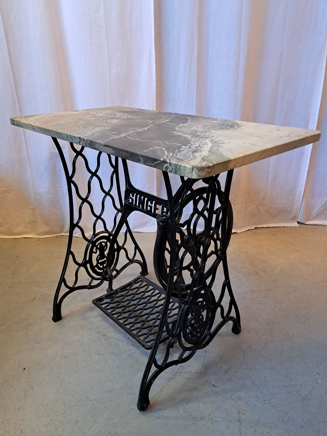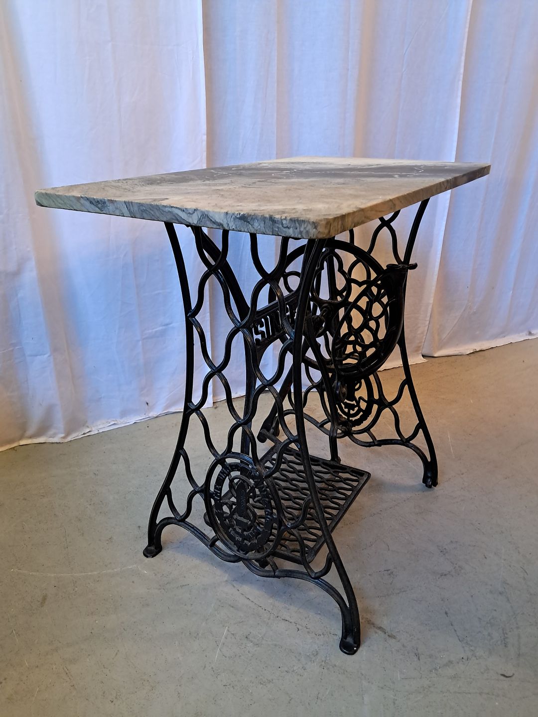 Symaskinestel fra Singer m. Marmorplade på.Højde: 73 cm. Bredde: 45 cm. Dybde: 85 cm.