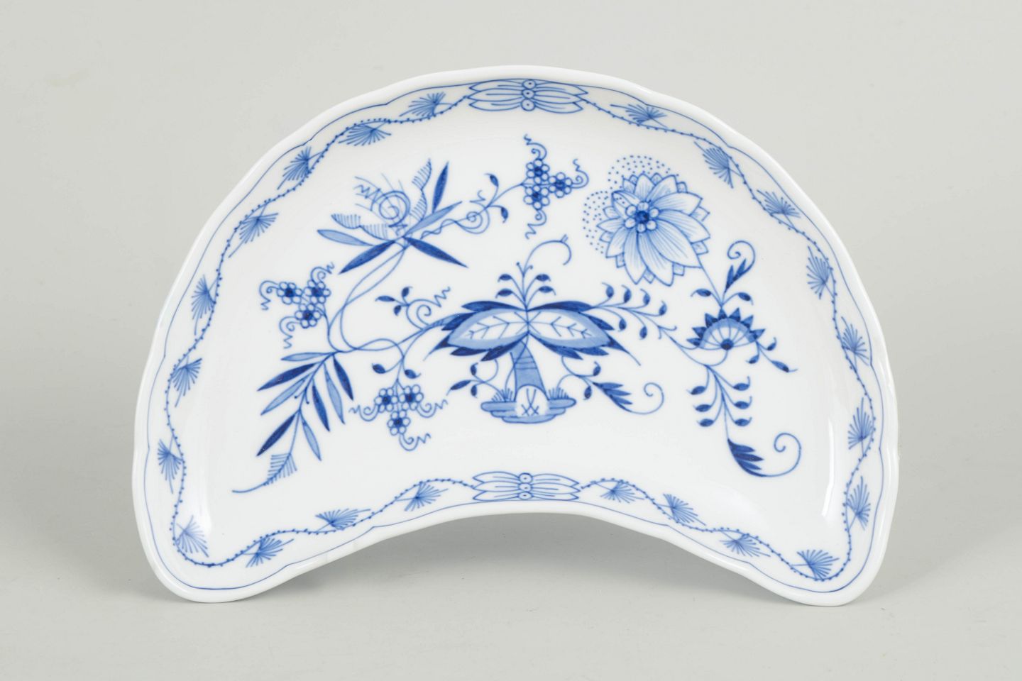 Meissen løgmønster, fad.Dekorativt fad i porcelæn med håndmalet blå dekoration i det klassiske løgmønster. Fremstillet hos Meissen i begyndelsen af 1900-tallet og markeret med Meissen krydssværd.