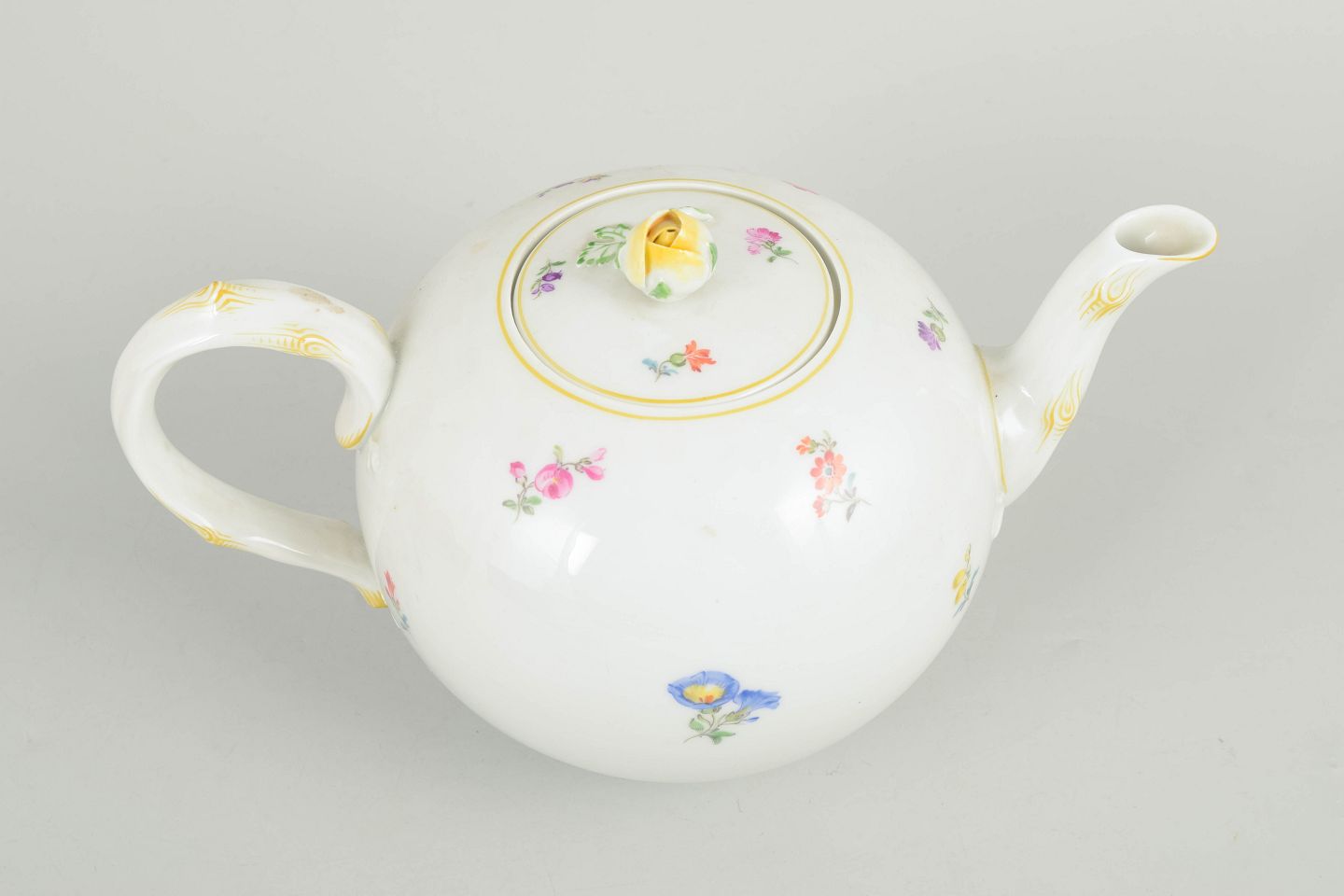 Meissen, tekande med polykrom blomsterdekoration.Tekande i porcelæn håndmalet med polykrome blomster og dekoreret med guldkant. Rund korpus med svungen tud og elegant hank samt låg med knop, udført i klassisk Meissen stil fra midten af det 20. århundrede. Undersiden mærket med Meissen krydssværd, første sortering.