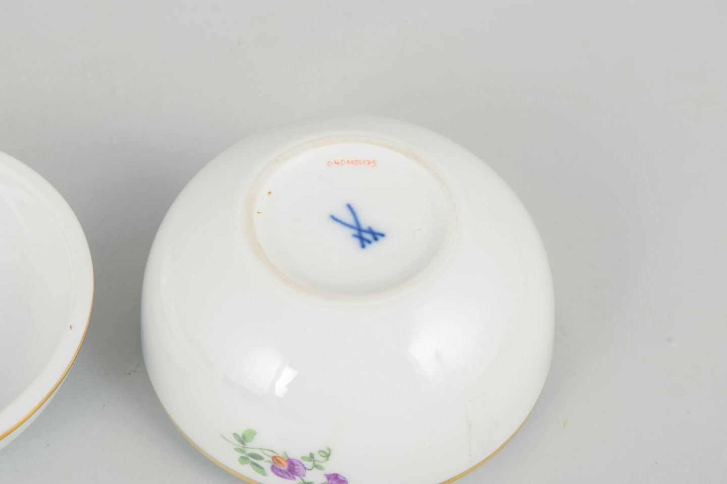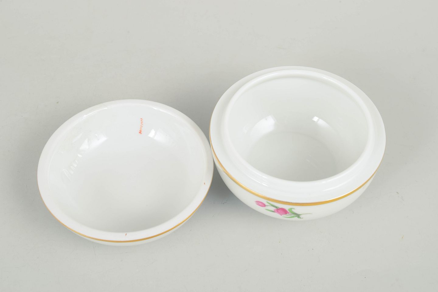 Meissen, lågkrukke med polykrom blomsterdekoration.Lågkrukke i porcelæn håndmalet med polykrome blomster og dekoreret med guldkant. Harmonisk rund form med fint tilpasset låg og klassisk Meissen dekoration fra midten af det 20. århundrede. Undersiden mærket med Meissen krydssværd, første sortering.