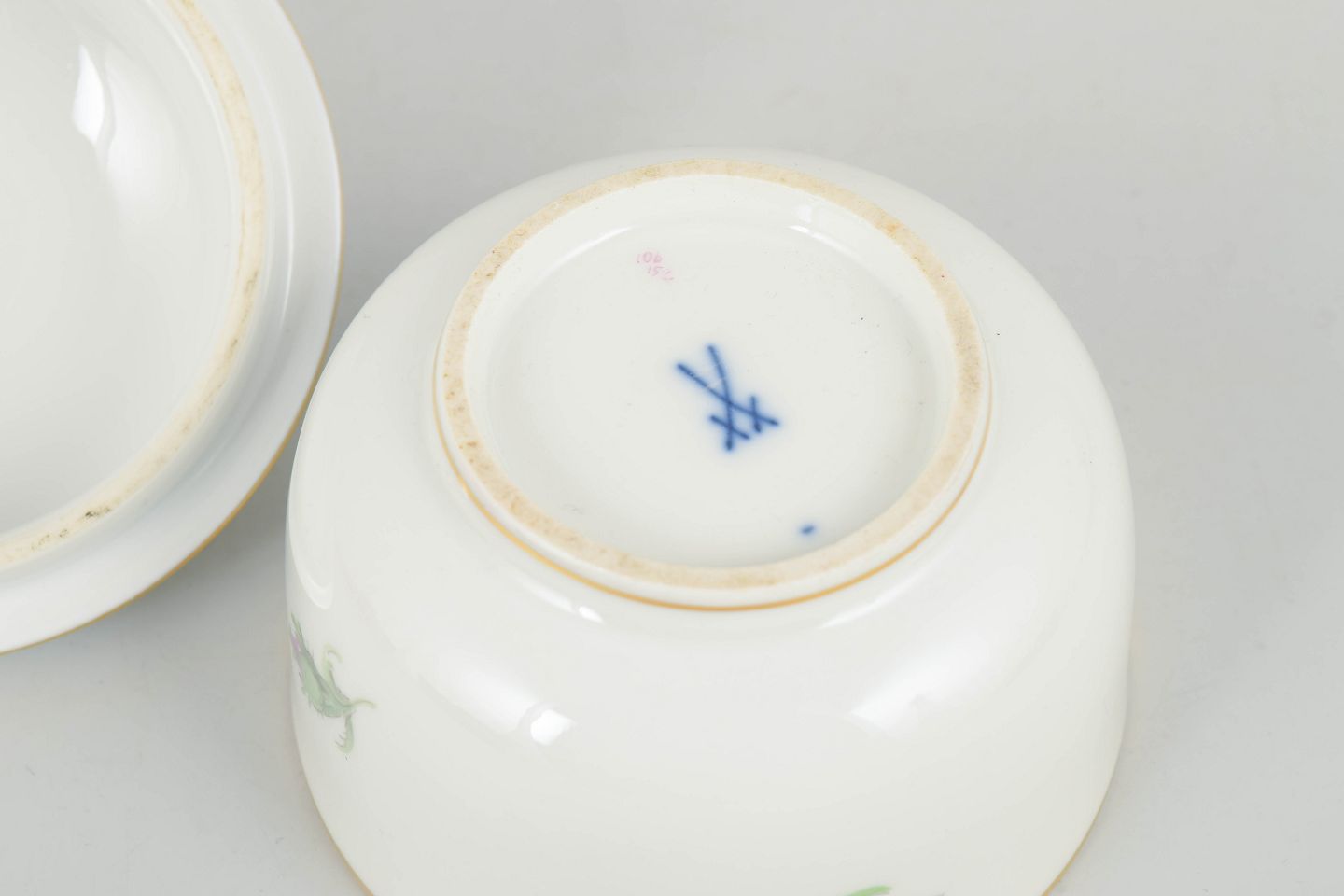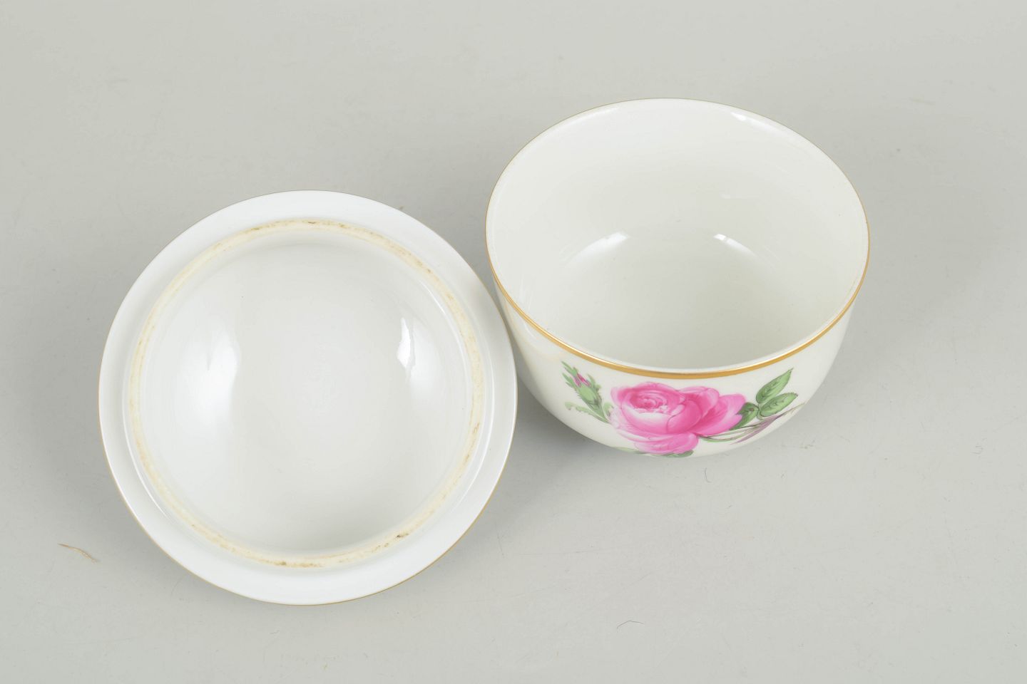 Meissen, sukkerskål med låg og polykrom blomsterdekoration.Sukkerskål i porcelæn med låg, håndmalet med polykrome blomster og guldkant. Dekoreret med større rosenmotiver og knopformet låggreb i klassisk Meissen stil fra midten af det 20. århundrede. Undersiden mærket med Meissen krydssværd.