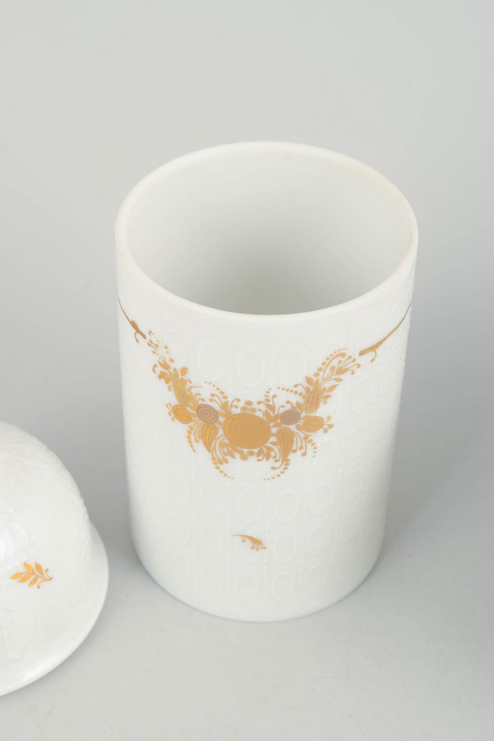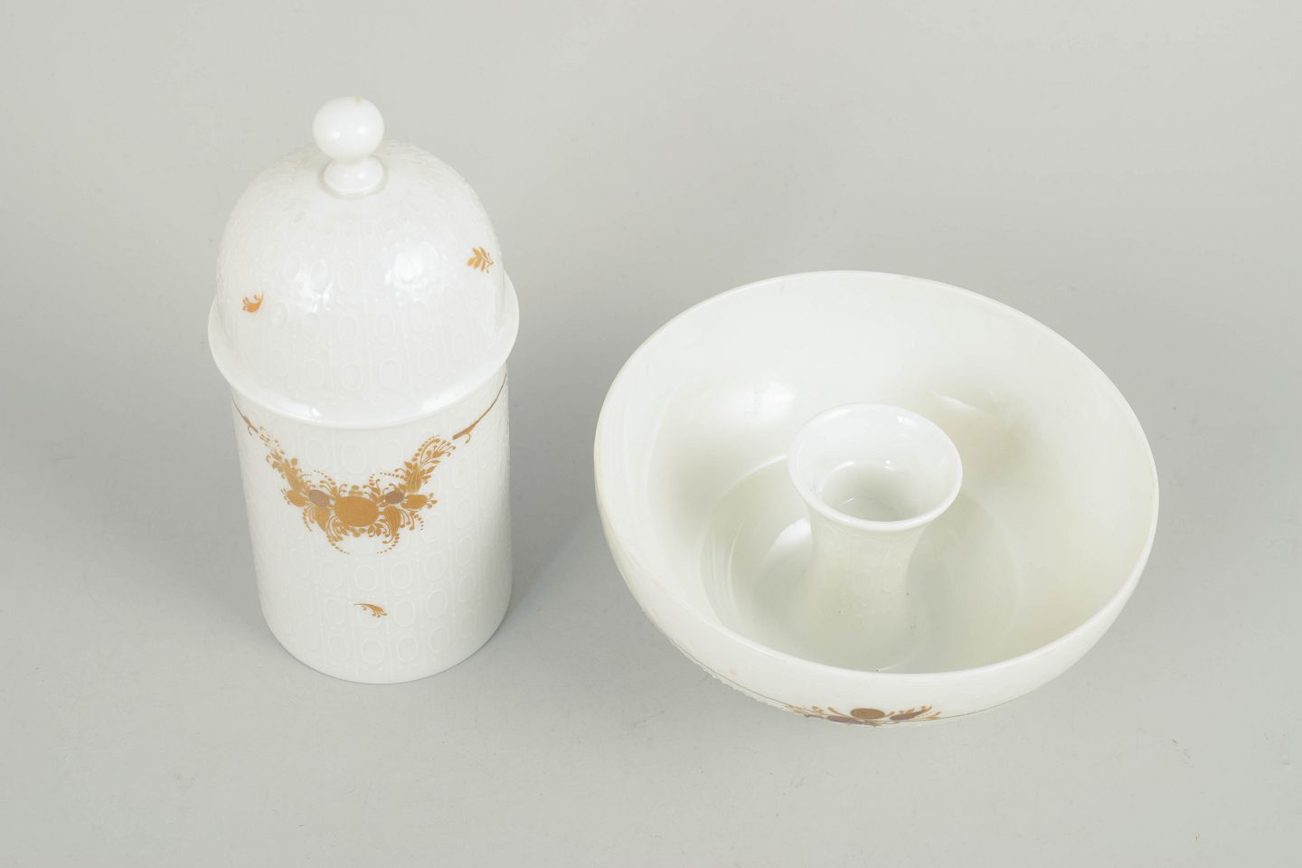 Bjørn Wiinblad for Rosenthal, lysestage og tedåse med låg.Sjældent sæt bestående af lysestage og tedåse med låg i porcelæn, dekoreret med det karakteristiske romantiske blomsterornament fra Romanze-serien. Elegant formsprog med fine gulddetaljer, typisk for Wiinblads dekorative univers i 1970’erne.