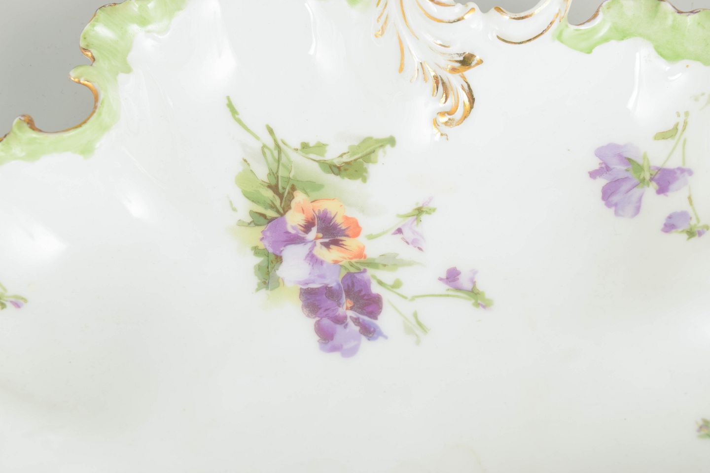 Dekorativ skål i porcelæn med bølget kant og gennembrudt greb, udsmykket med håndmalede blomster i lilla og grønne nuancer samt forgyldte detaljer, typisk for Rosenthals produktion i begyndelsen af det 20. århundrede.