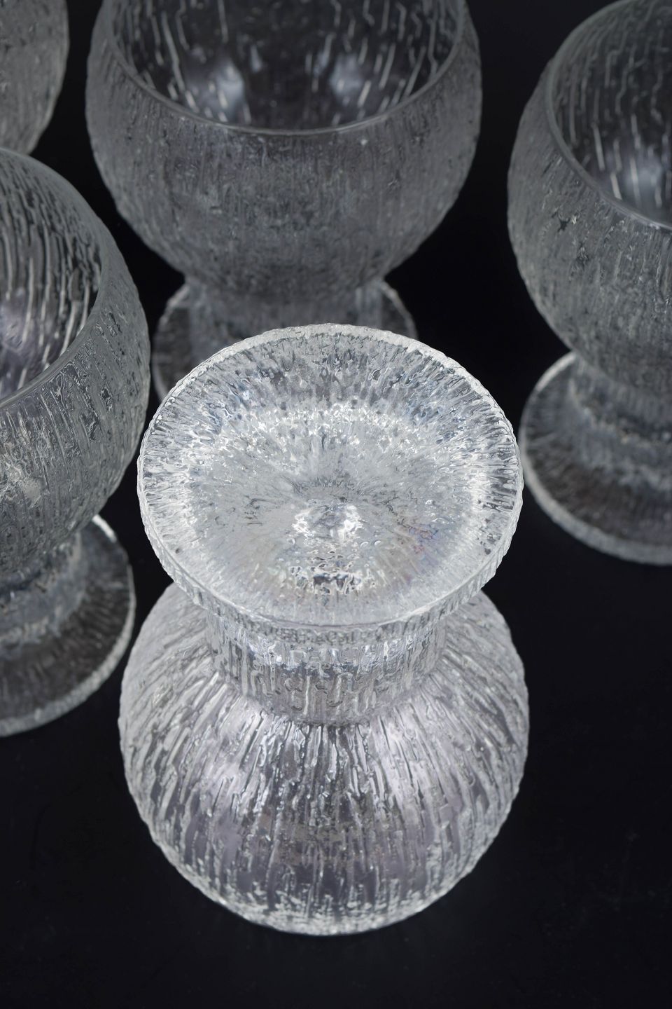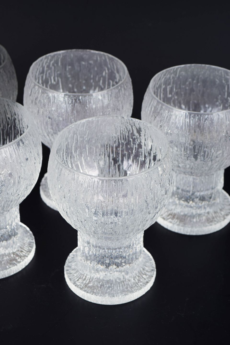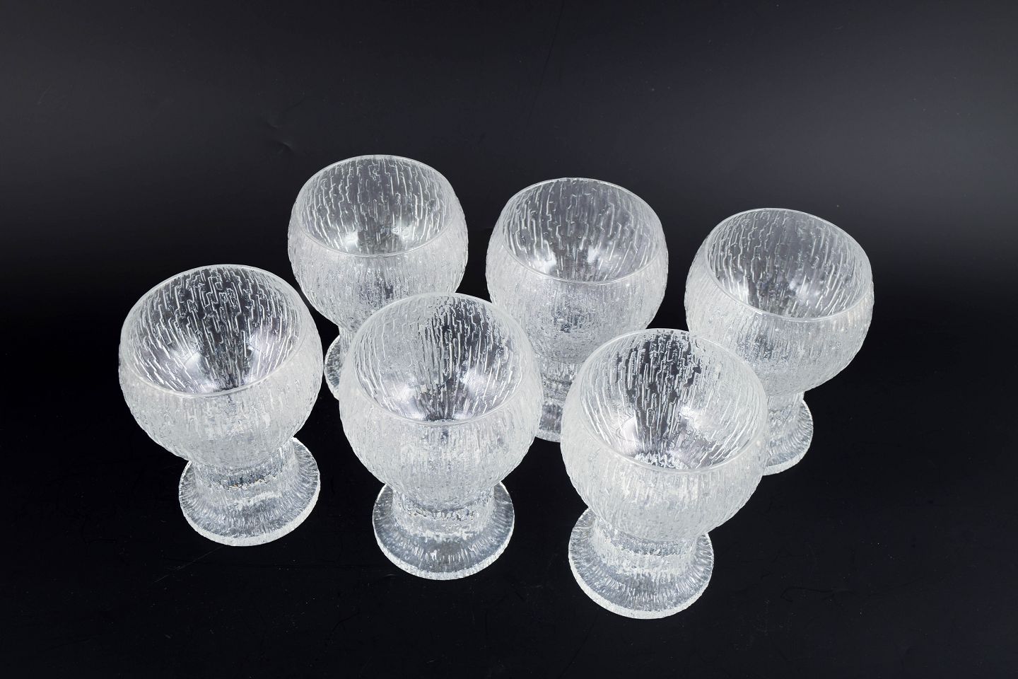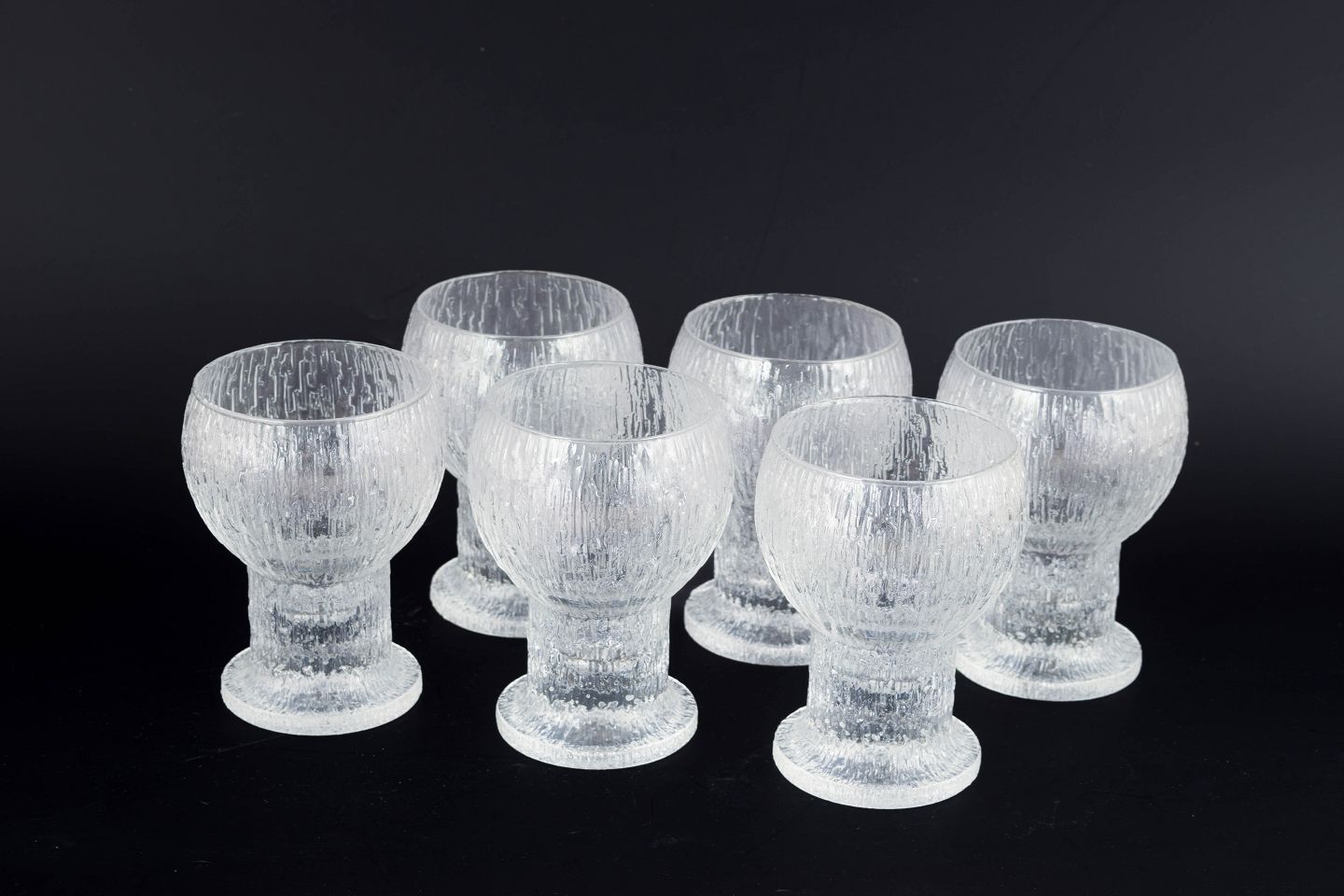 Timo Sarpaneva for Iittala, sæt af seks rødvinsglas.Elegante rødvinsglas fra Kekkerit-serien i klart glas med karakteristisk struktur og kraftig fod, designet i 1970’erne.