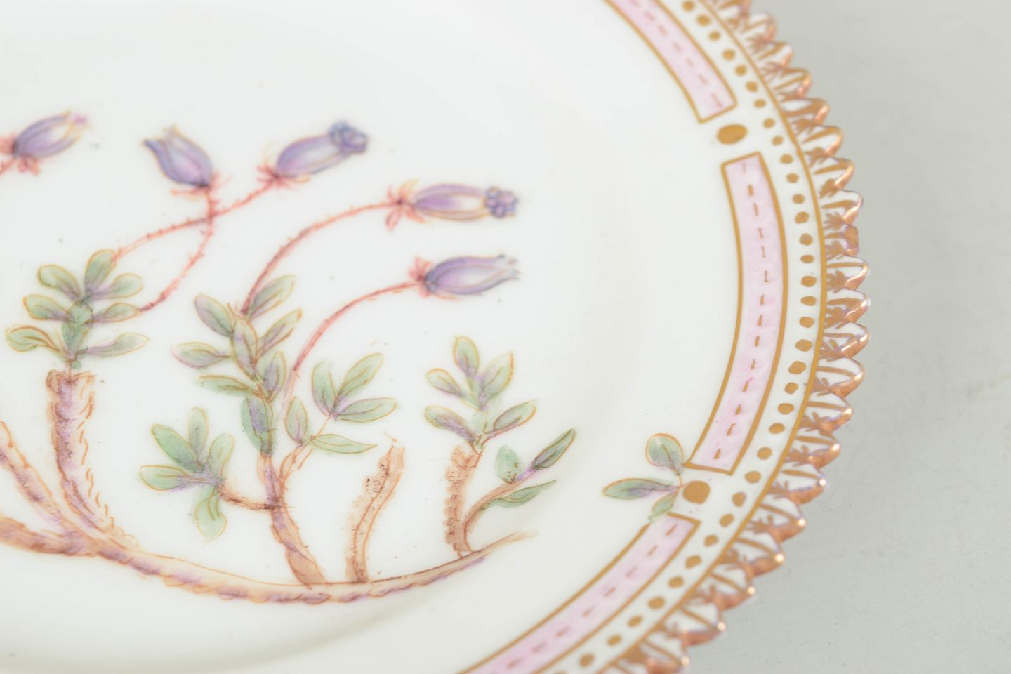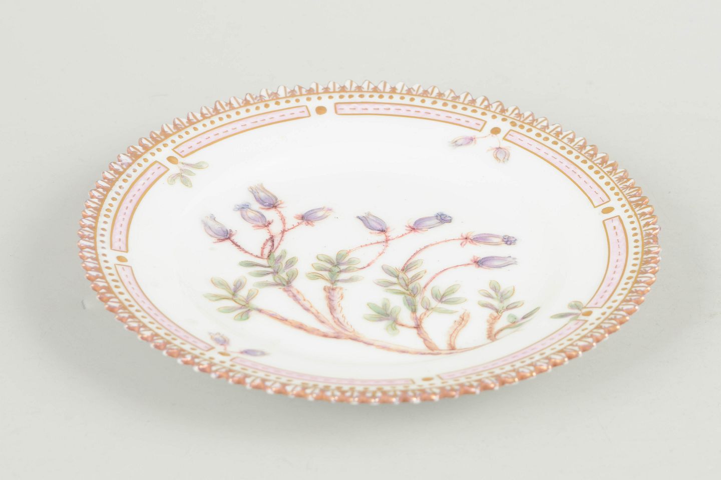 Royal Copenhagen Flora Danica, kagetallerken.Hånddekoreret porcelænstallerken med botanisk motiv fra Flora Danica-serien, hjemmedekoreret, fint udført med forgyldt rand og detaljerig gengivelse af planter.