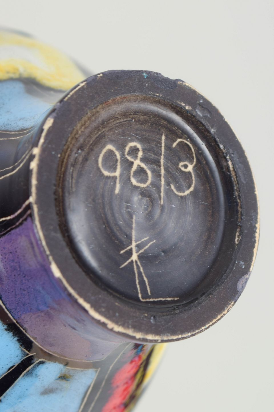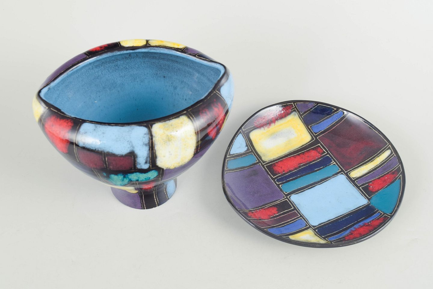 Dekorativ keramisk vase med integreret fod og tilhørende underfad, udført i flerfarvet glasur med abstrakte felter i blå, røde, gule og violette nuancer. Et karakteristisk eksempel på tysk kunstkeramik fra midten af det 20. århundrede.