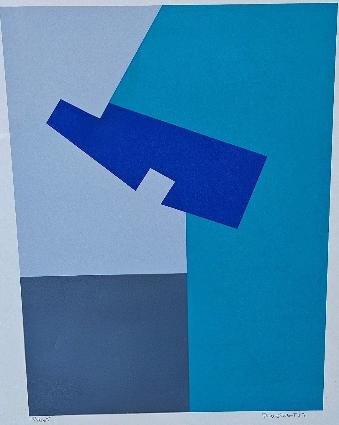 Litografi med abstrakt motiv i blå, turkis og grå monteret i metalramme. Nr. 12/46 og dateret 1989Kunstner Peder Meinert, signeret