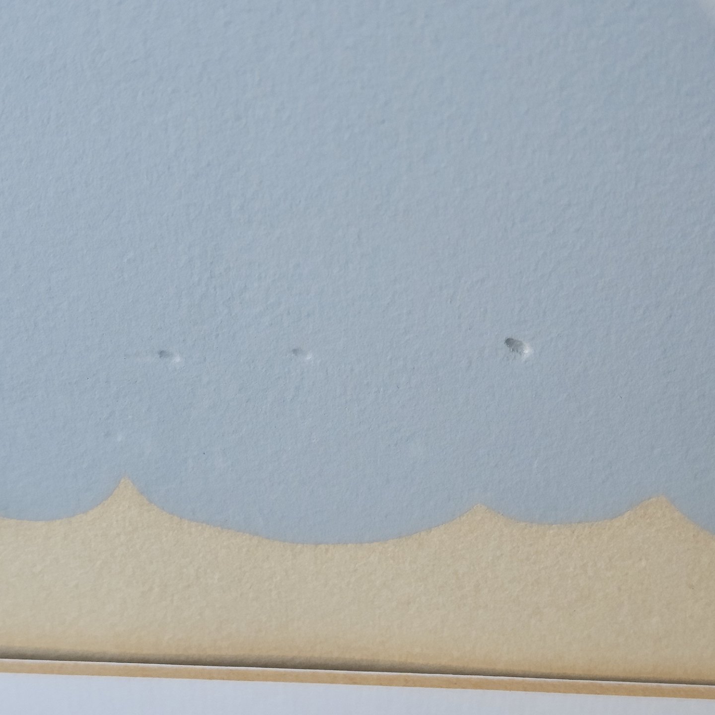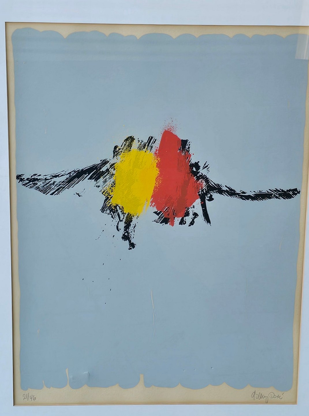 Litografi på papir med abstrakt motiv i sort, gul og rød monteret i sølv rammeVi har to styk