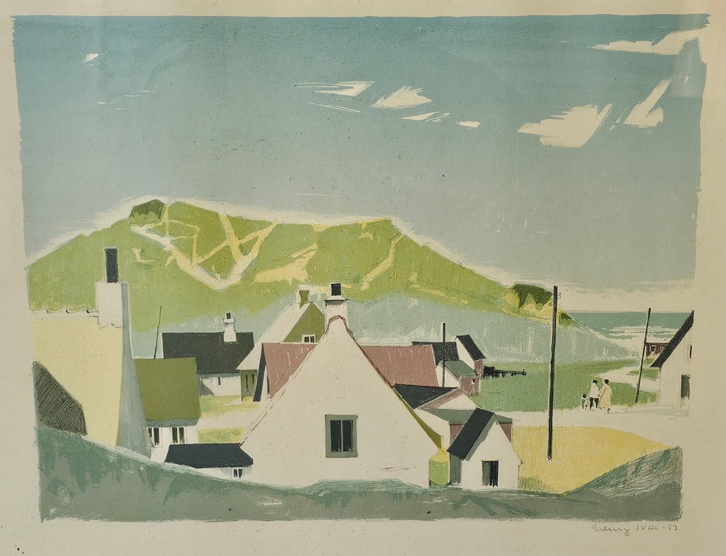 Litografi med titlen Klitter ved Lønstrup med motiv af et dansk sommer landskab monteret i sort og hvid træramme, dateret 1953Kunstner Erling Juhl (1922-1989), signeret