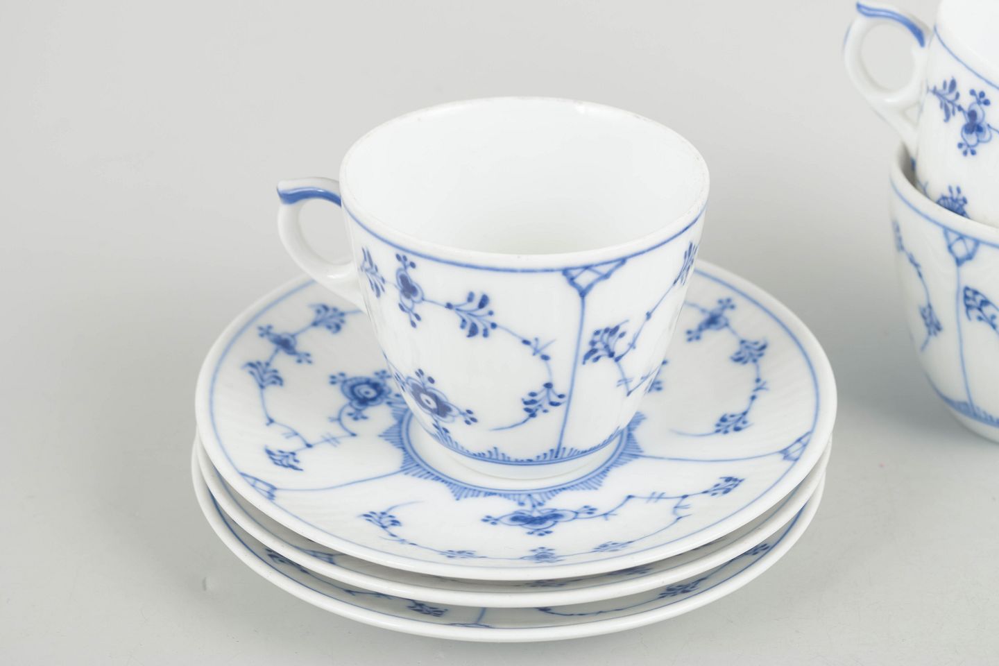Royal Copenhagen Musselmalet Riflet, sæt af tre kaffekopper med underkopper.Tre kaffekopper med tilhørende underkopper i porcelæn med håndmalet dekoration i underglasurblå i det klassiske Musselmalet Riflet mønster. Model 1/80. Første sortering.