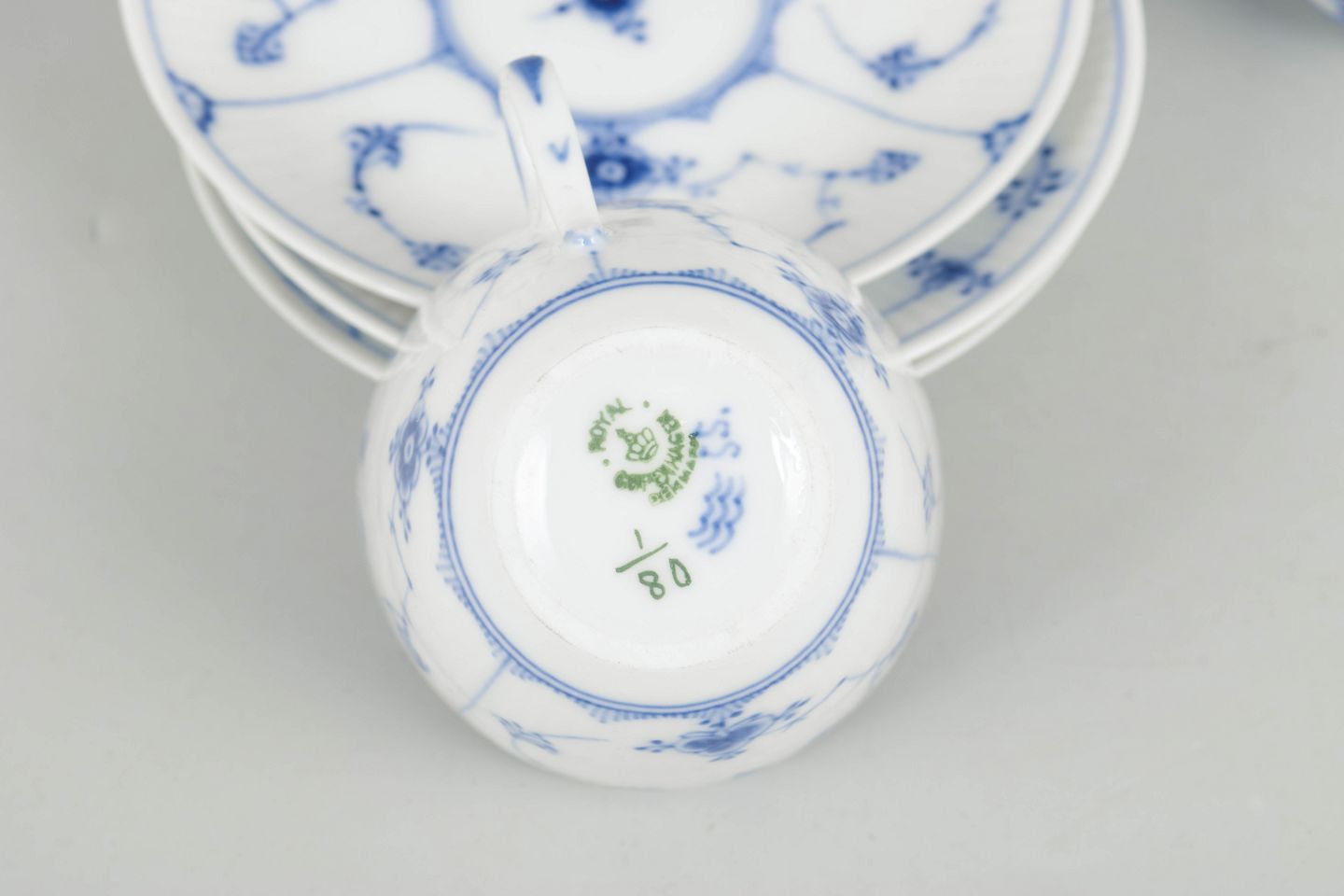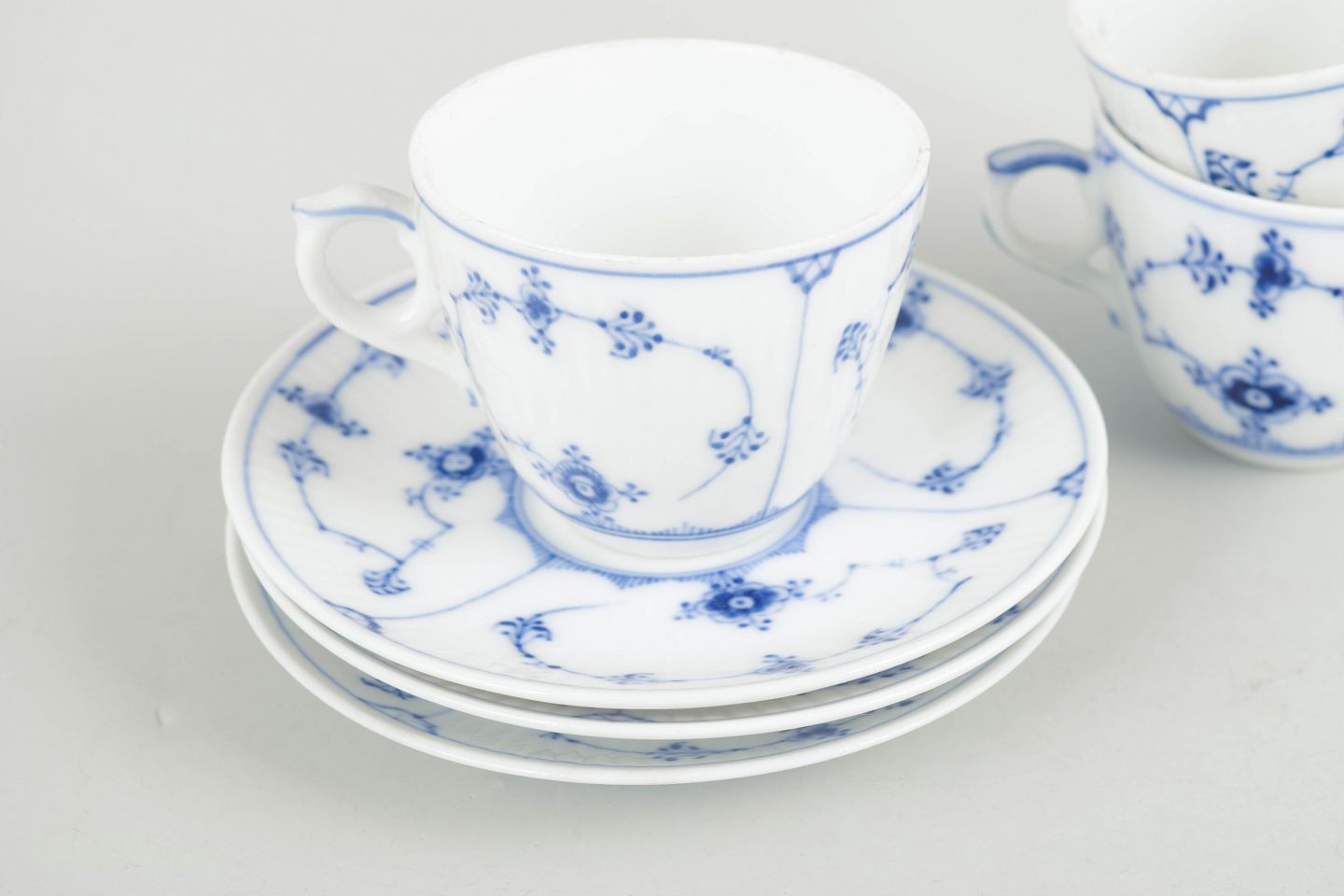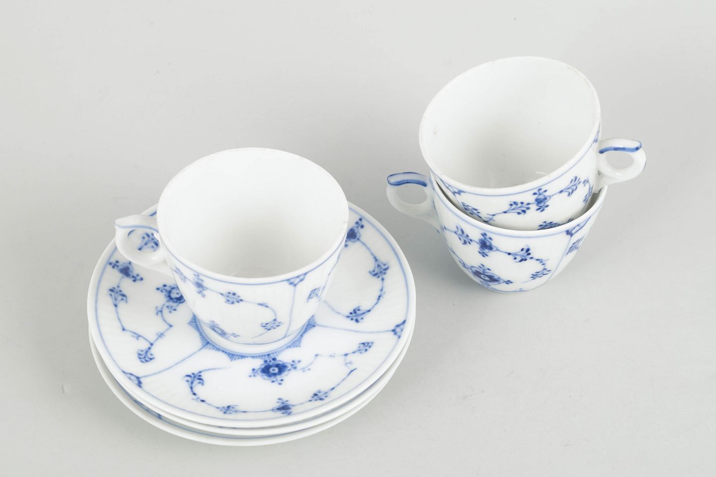Royal Copenhagen Musselmalet Riflet, sæt af tre kaffekopper med underkopper.Tre kaffekopper med tilhørende underkopper i porcelæn med håndmalet dekoration i underglasurblå i det klassiske Musselmalet Riflet mønster. Model 1/80. Første sortering.