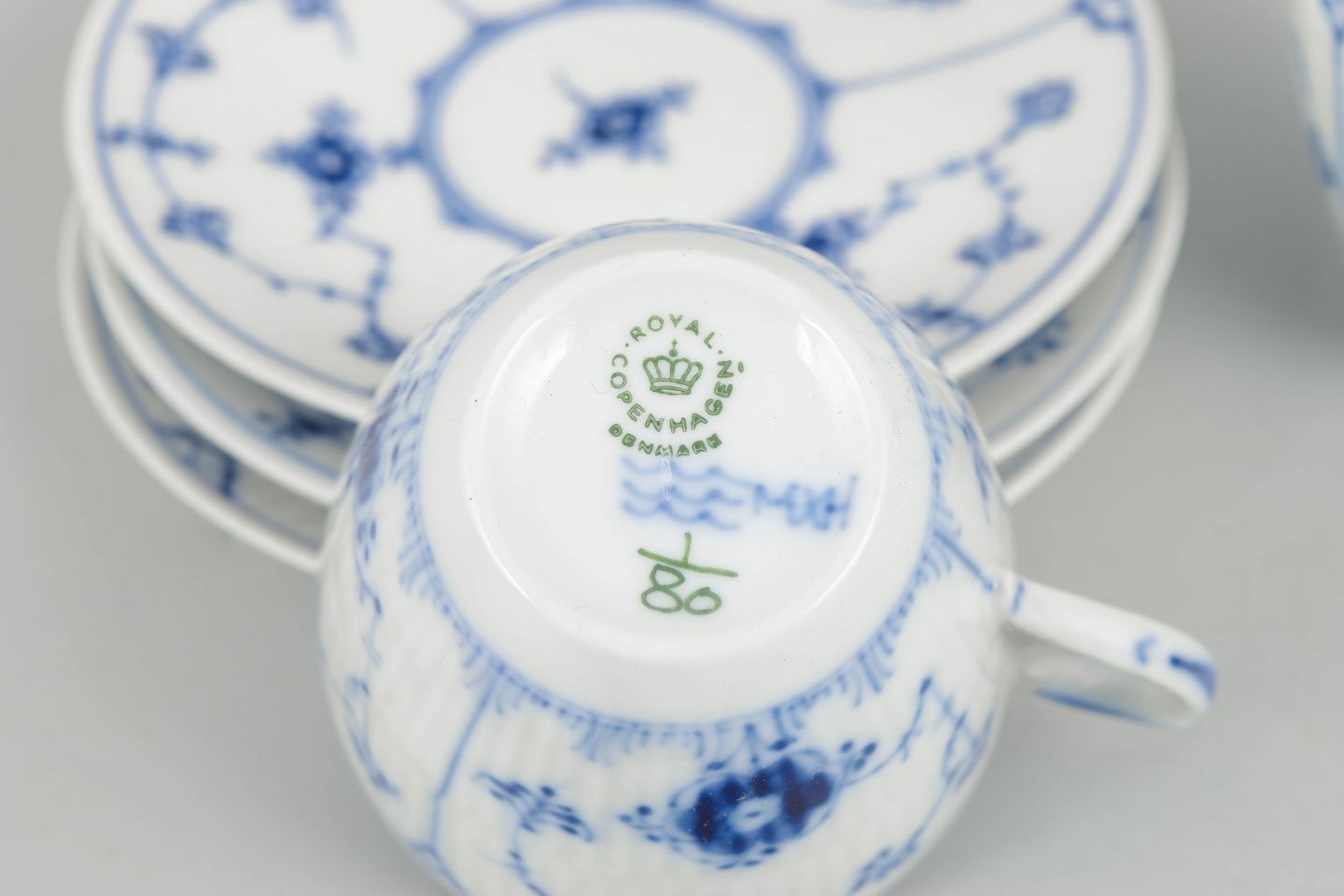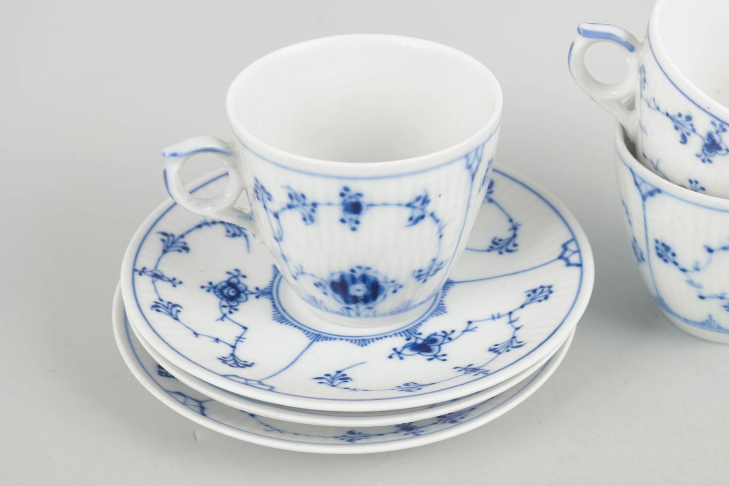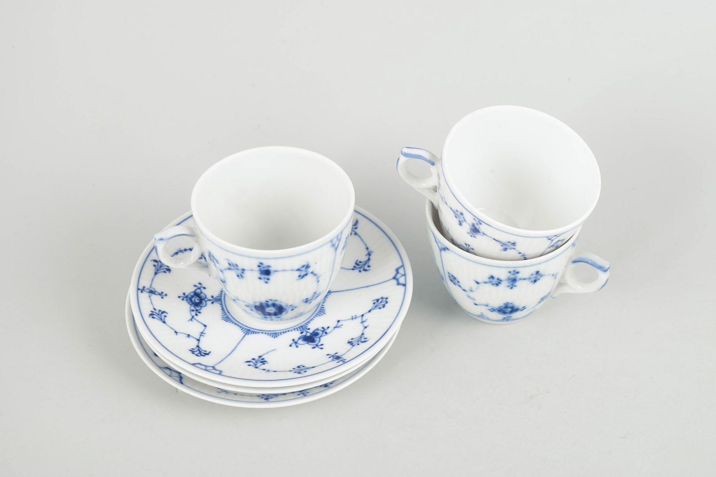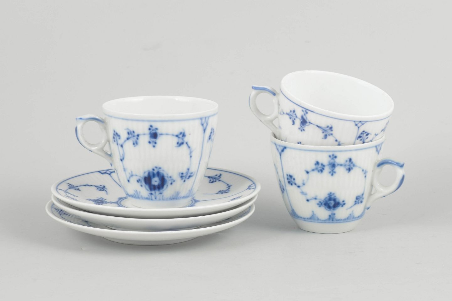 Royal Copenhagen Musselmalet Riflet, sæt af tre kaffekopper med underkopper.Tre kaffekopper med tilhørende underkopper i porcelæn med håndmalet dekoration i underglasurblå i det klassiske Musselmalet Riflet mønster. Model 1/80. Første og anden sortering.