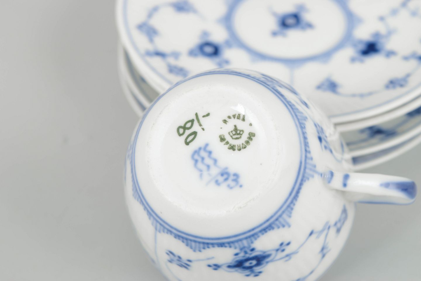 Royal Copenhagen Musselmalet Riflet, sæt af fire kaffekopper med underkopper.Fire kaffekopper med tilhørende underkopper i porcelæn med håndmalet dekoration i underglasurblå i det klassiske Musselmalet Riflet mønster. Model 1/80. Første og anden sortering.