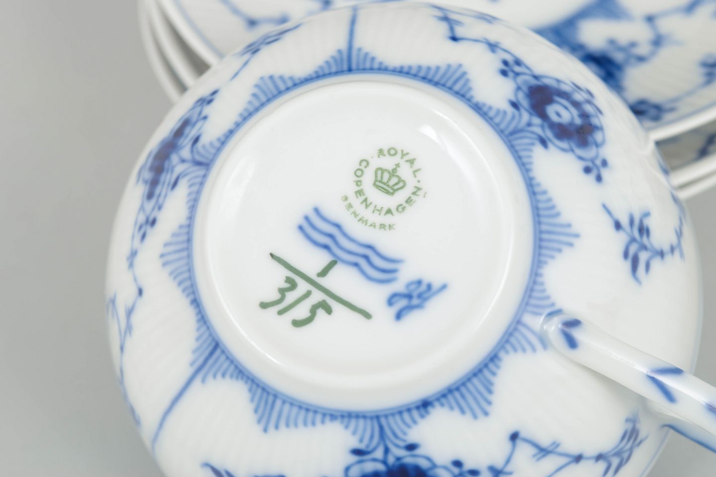 Royal Copenhagen Musselmalet Riflet, sæt af tre tekopper med underkopper.Tre tekopper med tilhørende underkopper i porcelæn med håndmalet dekoration i underglasurblå i det klassiske Musselmalet Riflet mønster. Model 1/315. Første sortering.