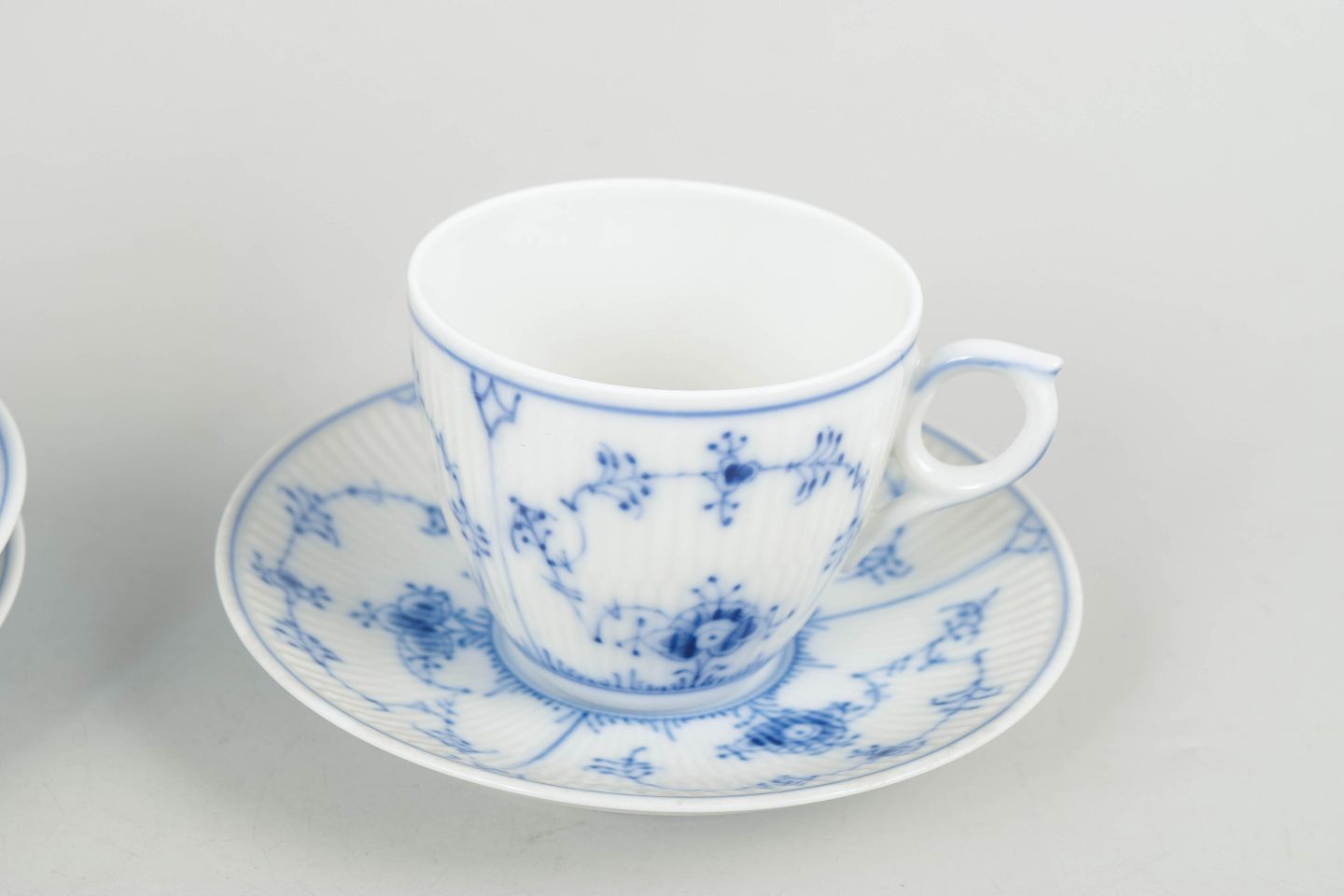 Royal Copenhagen Musselmalet Riflet kaffekopper med underkopper, sæt af tre.Kaffekopper med tilhørende underkopper i porcelæn med håndmalet dekoration i underglasurblå i det klassiske Musselmalet Riflet mønster. Model 1/2162. Første sortering.
