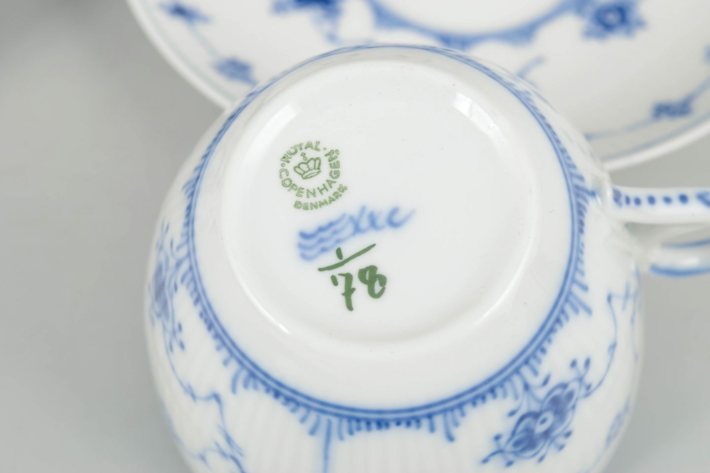 Royal Copenhagen Musselmalet Riflet morgenkopper med underkopper, par. Sjælden.Morgenkopper med tilhørende underkopper i porcelæn med håndmalet dekoration i underglasurblå i det klassiske Musselmalet Riflet mønster. Model 1/78. Første sortering.
