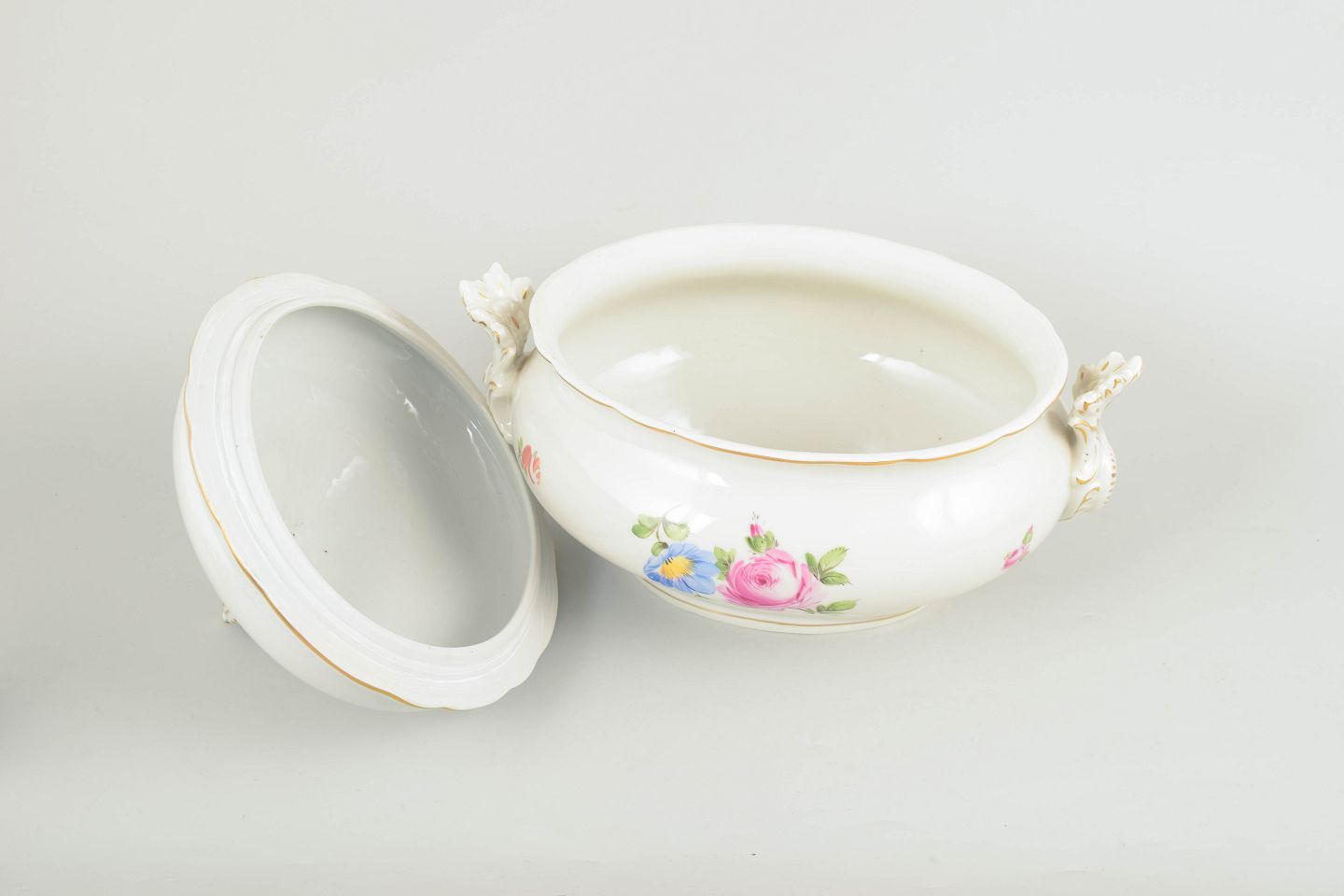 Meissen stor terrin med låg, Saksisk blomst.Stor terrin i håndmalet porcelæn med floral dekoration i polykrome farver og forgyldte detaljer, udført i klassisk Saksisk blomst mønster. Uden synlig fabriksmærkning.
