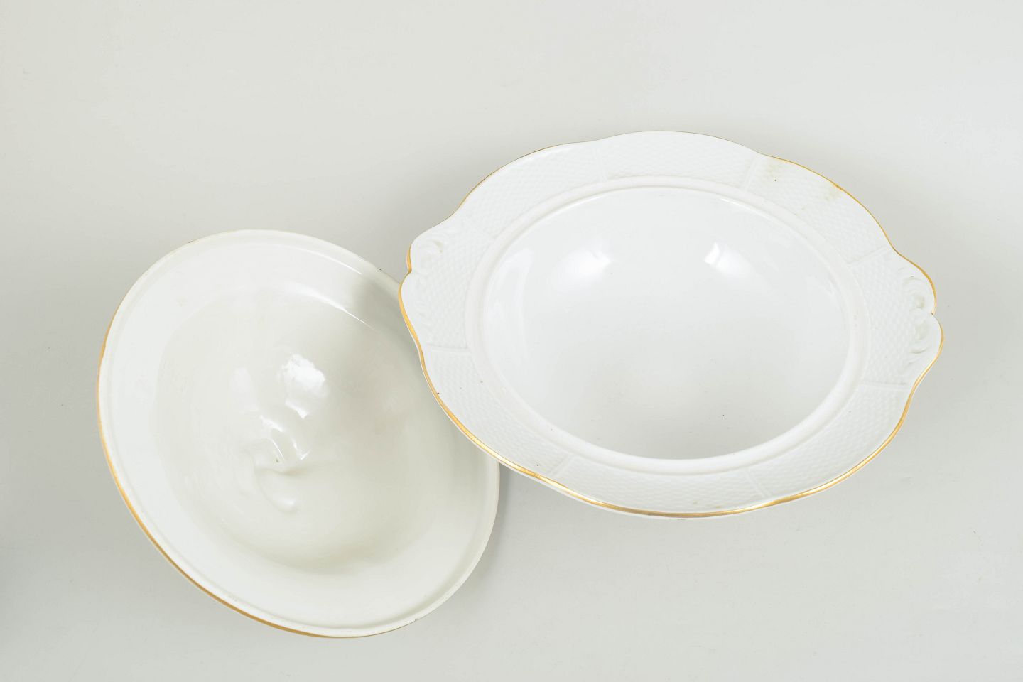 Dresden stor terrin med låg.Elegant terrin i porcelæn med låg, dekoreret med håndmalede blomster og forgyldte detaljer langs kanten. Klassisk form med svungen knop og reliefmønster.