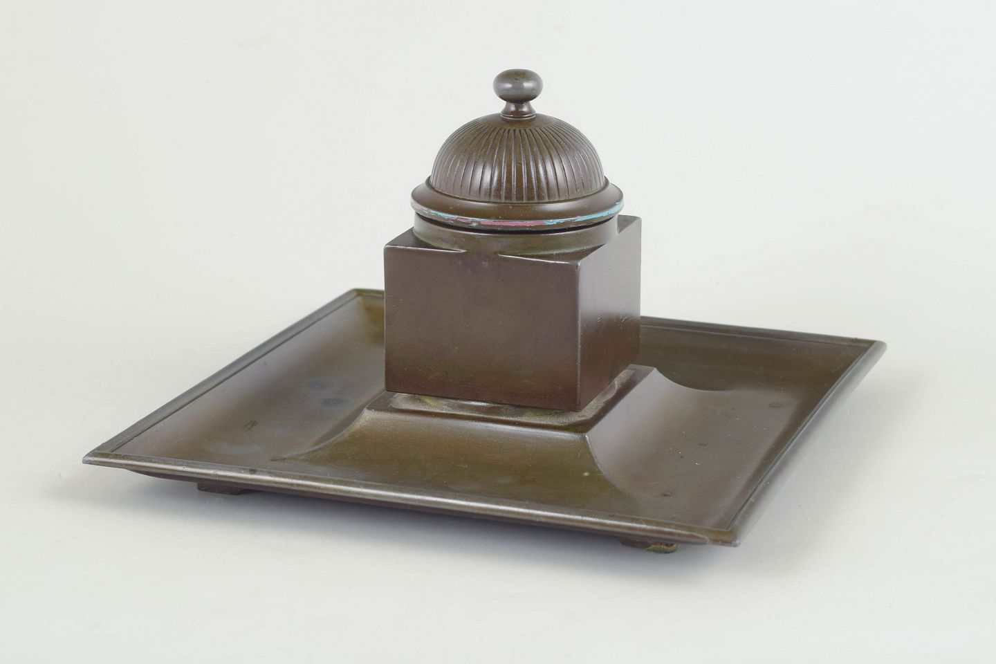 Just Andersen, blækhus i diskometal.Blækhus i diskometal med kvadratisk bakke, firkantet beholder, riflet låg og original glasindsats. Model 162.