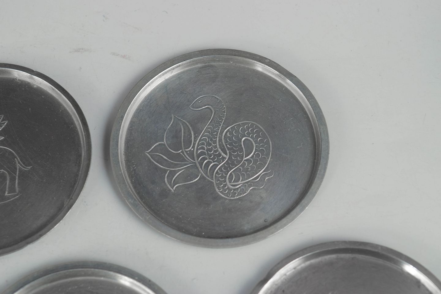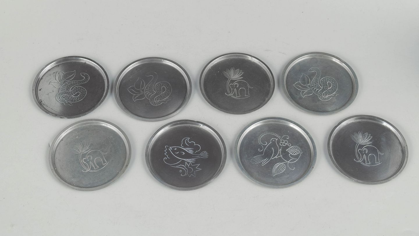 Just Andersen, sæt af otte glasbakker i tin.Sæt af otte flaskeunderlag i tin med indgraverede dyremotiver i et stiliseret art deco formsprog. Model 1166.