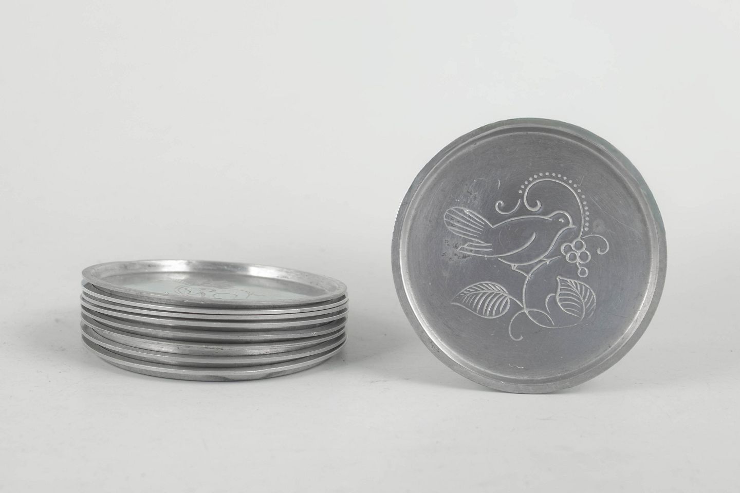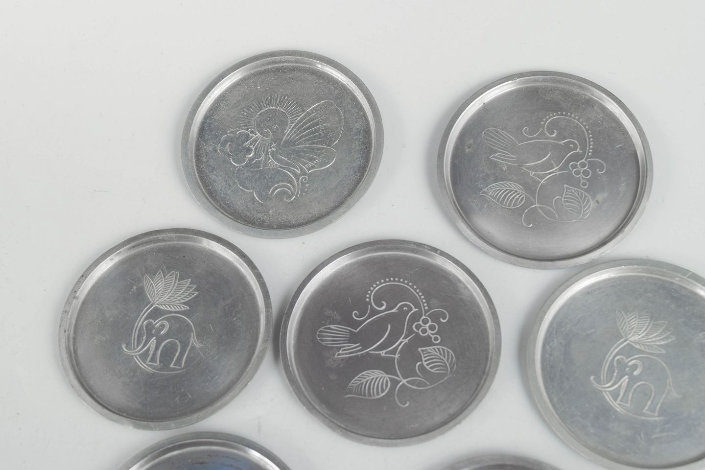 Just Andersen, sæt af ni flaskebakker i tin.Sæt af ni flaskebakker i tin med indgraverede dyremotiver i et stilrent art deco formsprog. Model 1166.