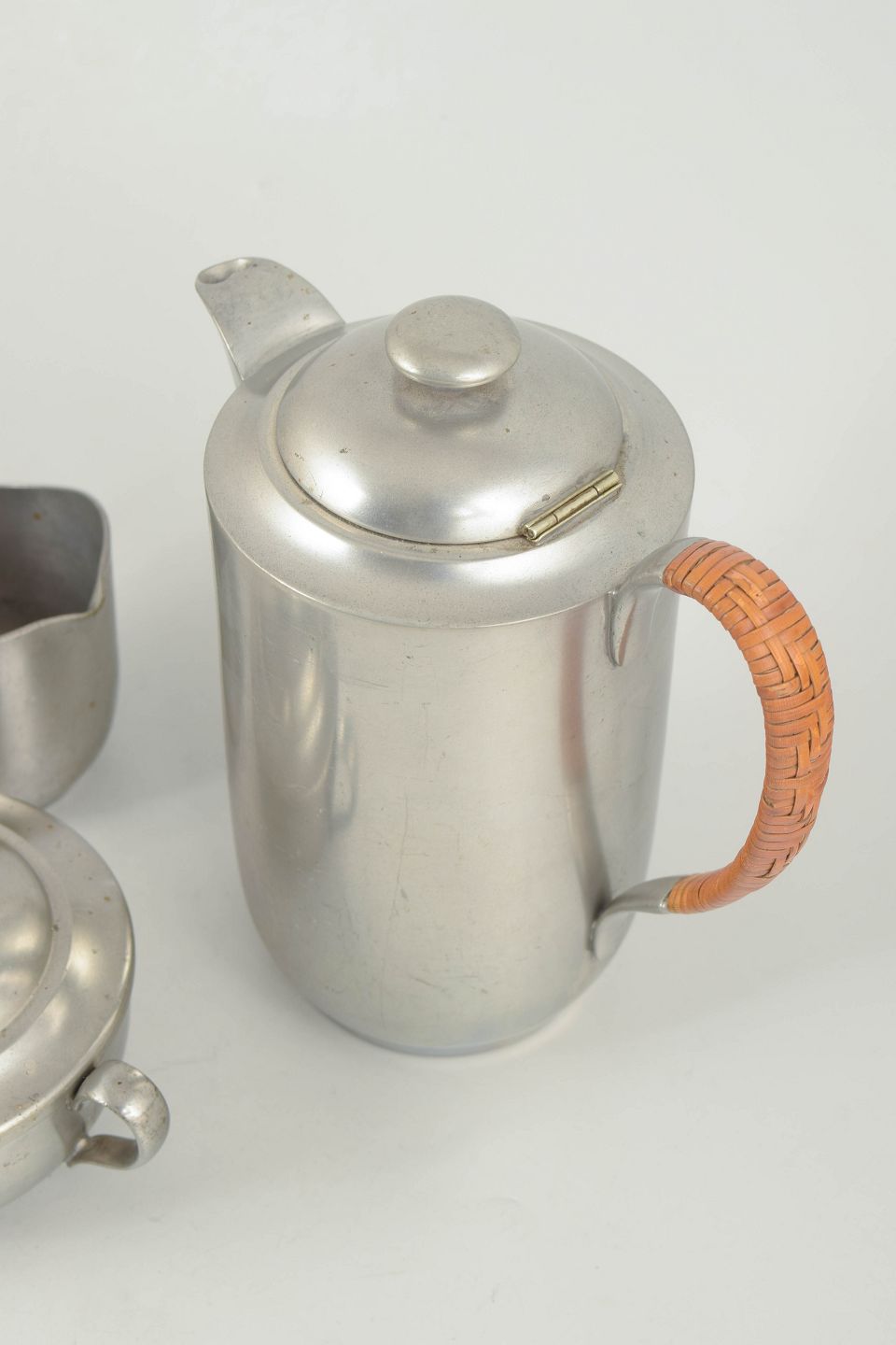 Just Andersen, kaffesæt i tin.Kaffesæt i tin udført i art deco stil, bestående af kaffekande med flettet hank, flødekande og sukkerskål med låg. Kaffekande model 1303. Flødekande model 1560. Sukkerskål model 1560B.