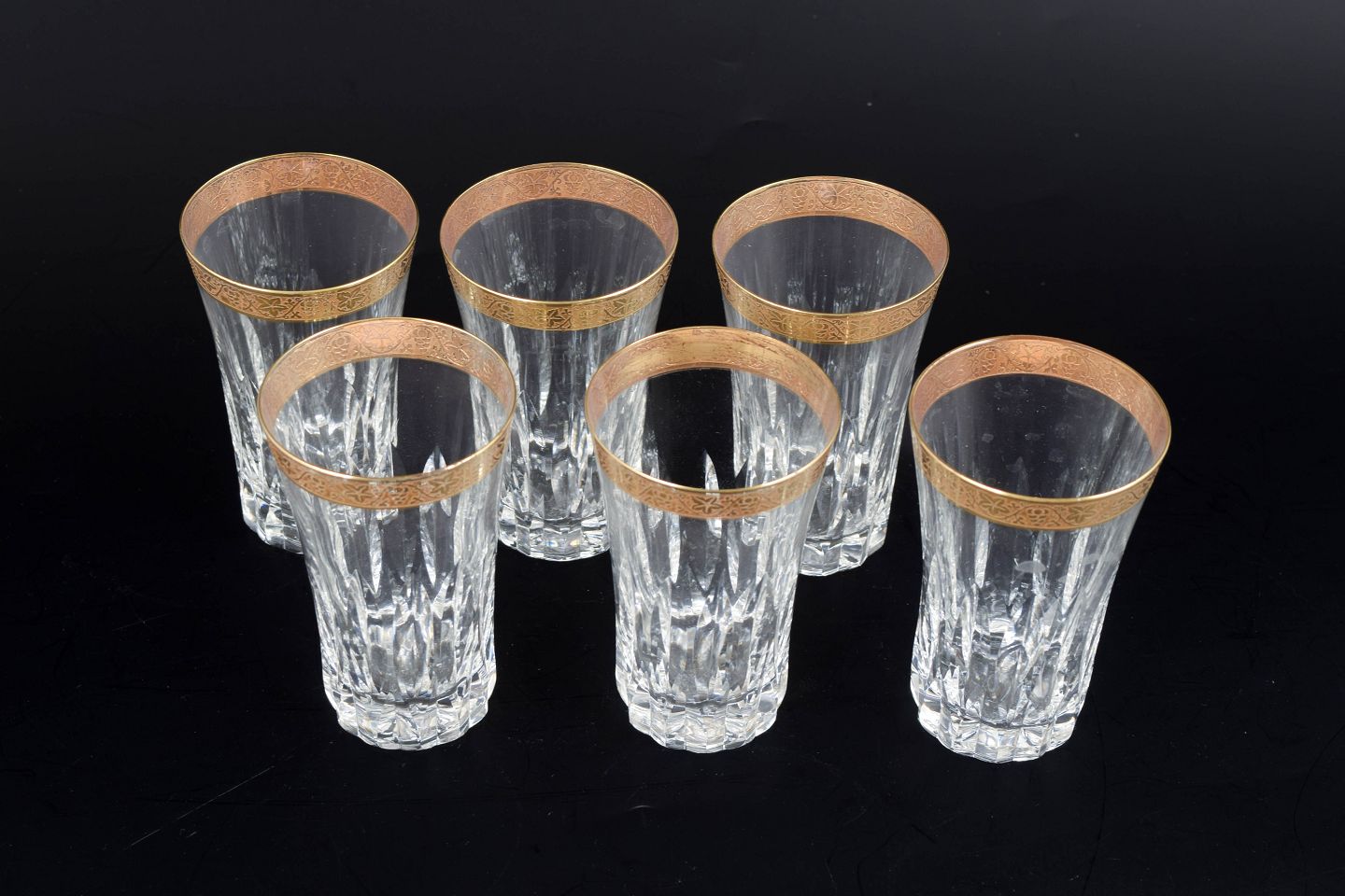 Elegante drikkeglas i facetslebet krystal med dekoration i 24 karat guld langs kanten, udført i klassisk midten af det 20. århundrede stil.