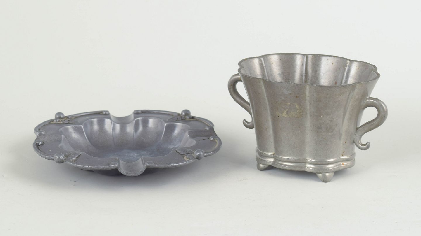 Just Andersen, vase og fad.Vase og fad i tin udført i et elegant art deco formsprog med bløde kurver og stiliserede detaljer. Vase model 46. Fad model 1214.