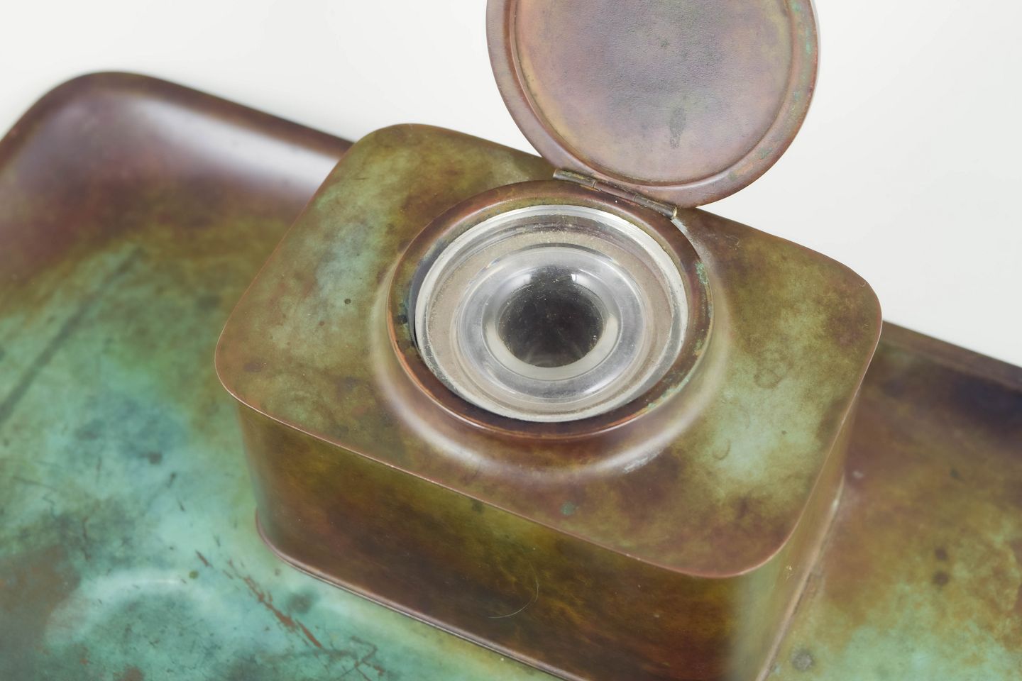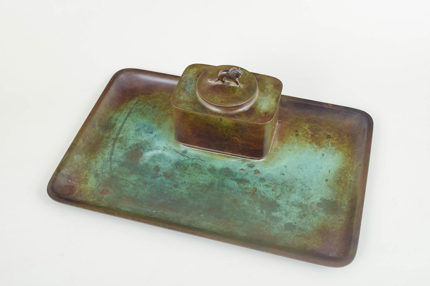 Just Andersen, art deco blækhus.Blækhus i legeret bronze med rektangulær bakke, kvadratisk beholder med låg og original glasindsats. Model LB 1820.