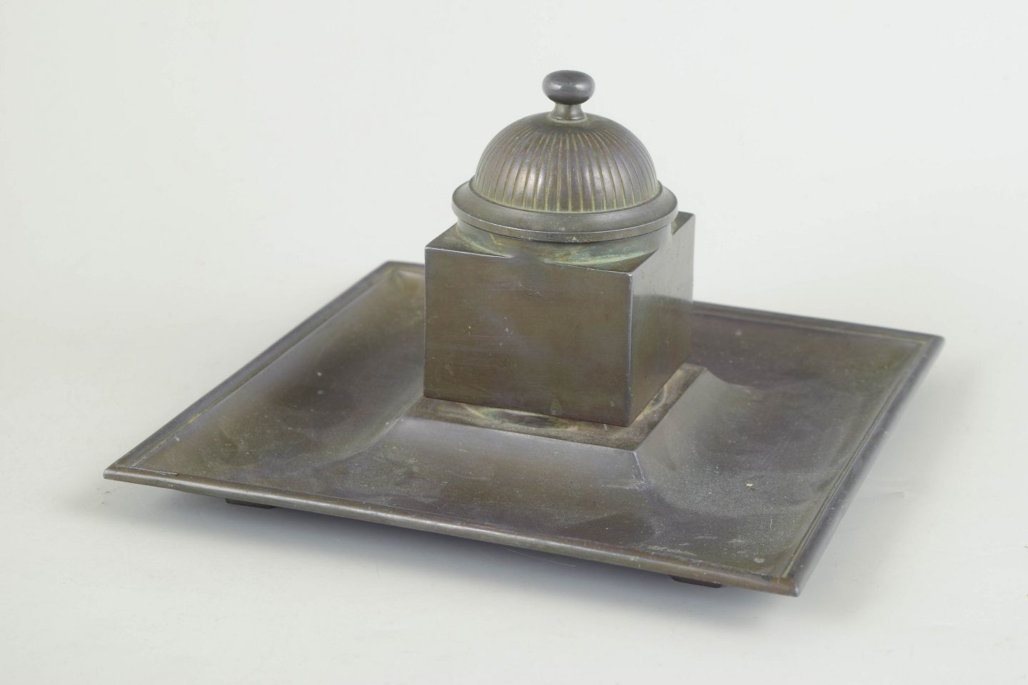 Just Andersen, blækhus model 162 i art deco stil.Blækhus i diskometal med kvadratisk bakke og original glasindsats, toppet med riflet låg i klassisk art deco formsprog.