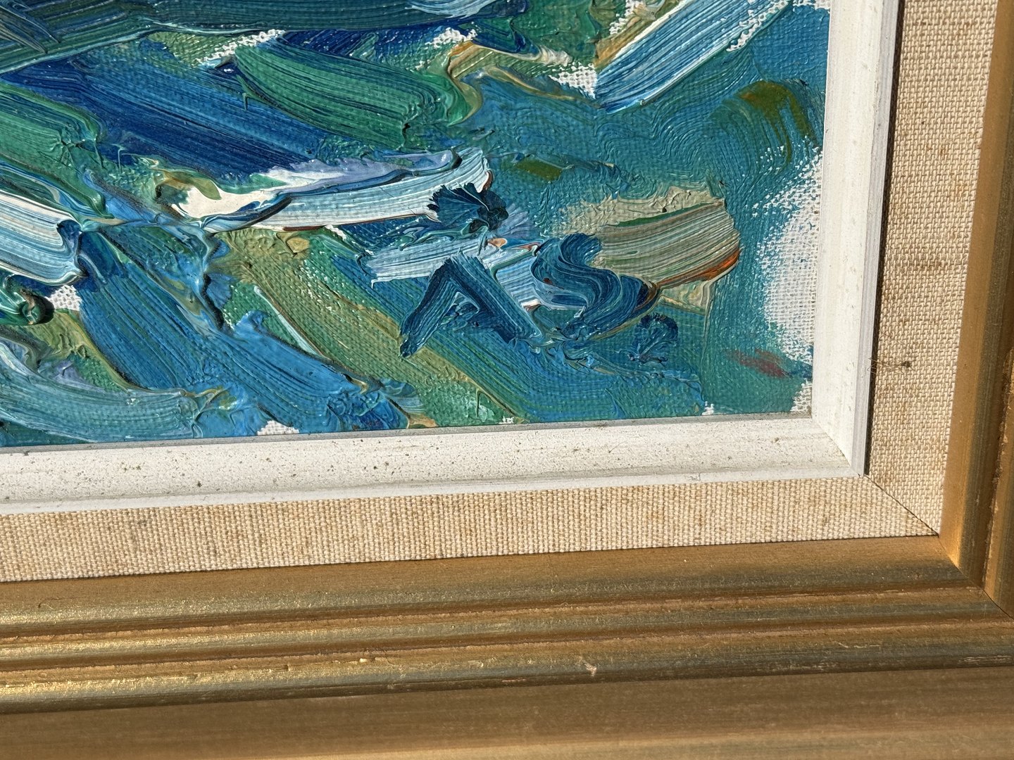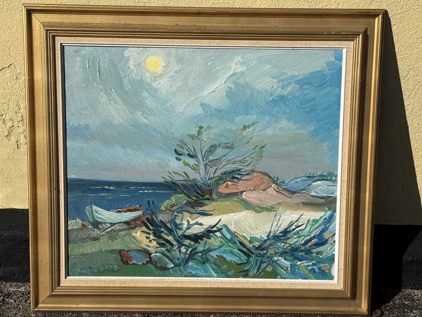 Aage Strand (1910-1975), oliemaleri på lærred, Båd ved strand, Signeret Å.S., mål med ramme 88x78cm *Fin stand*Lager: 1